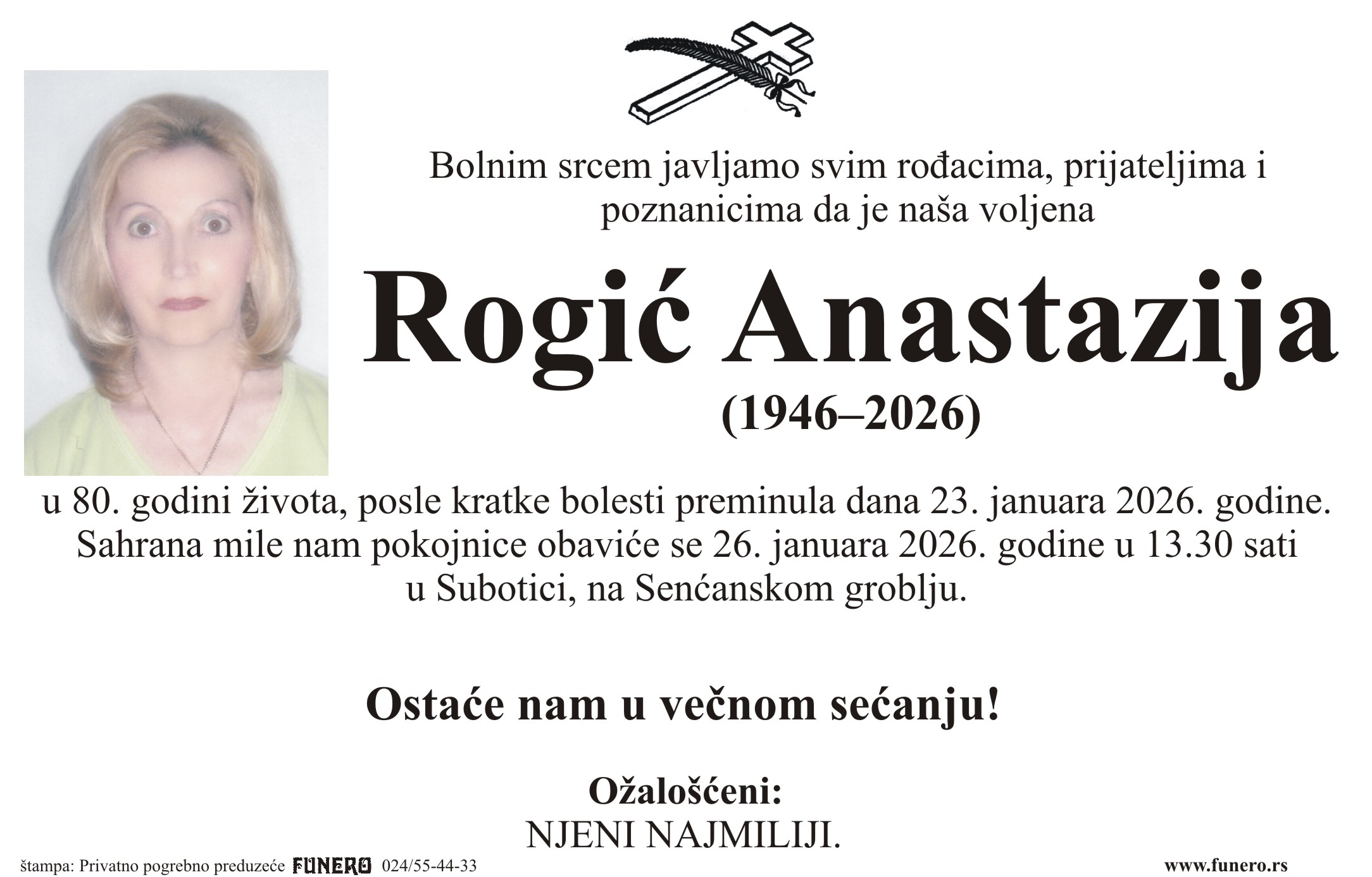U 80. godini preminula je Anastazija Rogić iz Subotice, iz Celovečke ulice. Sahrana je 26. januara u 13 sati i 30 minuta na Senćanskom groblju.