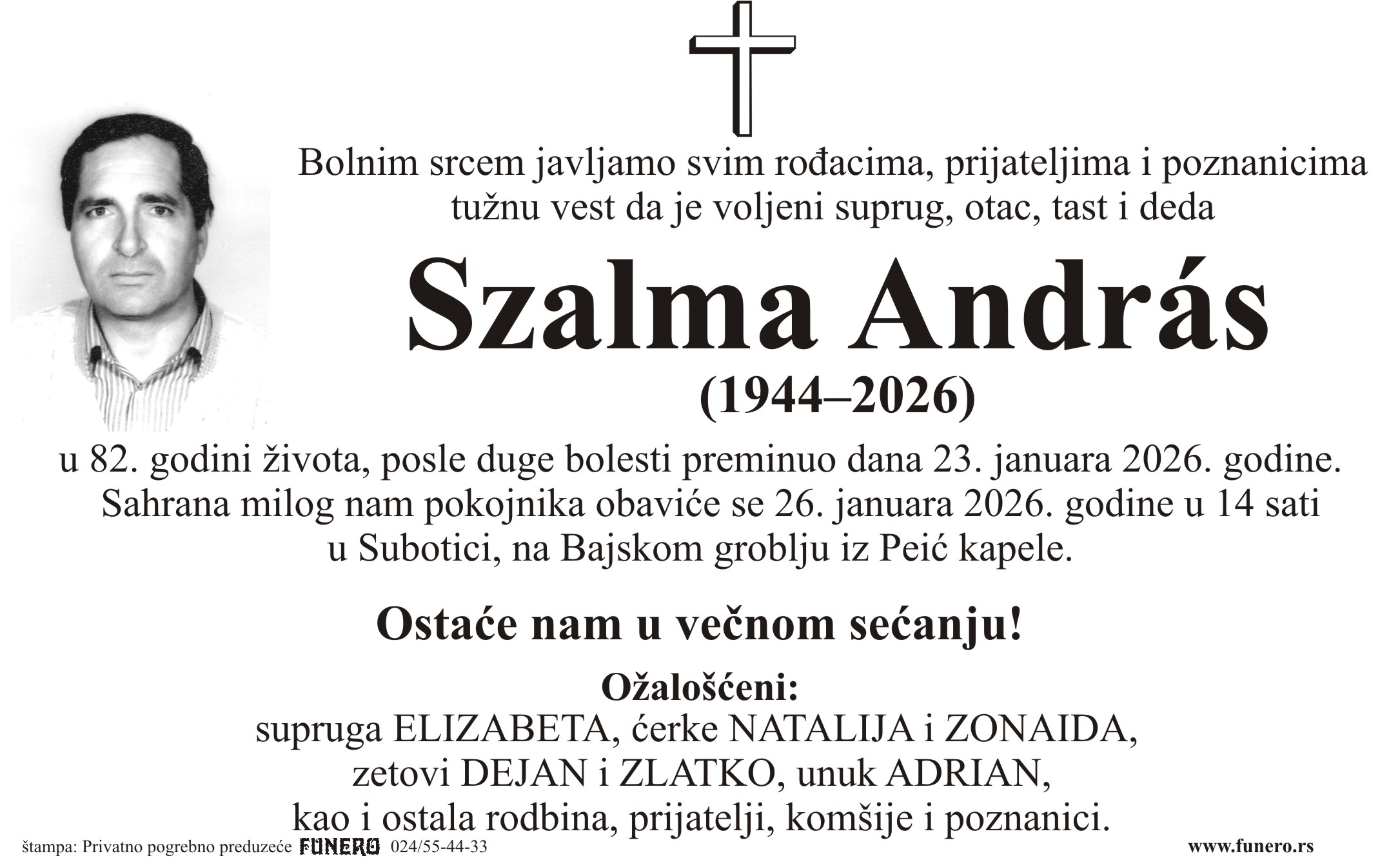 U 82. godini preminuo je Andraš Salma iz Subotice, iz ulice Ivana Sarića. Sahrana je 26. januara u 14 sati na Bajskom groblju iz Peić kapele.