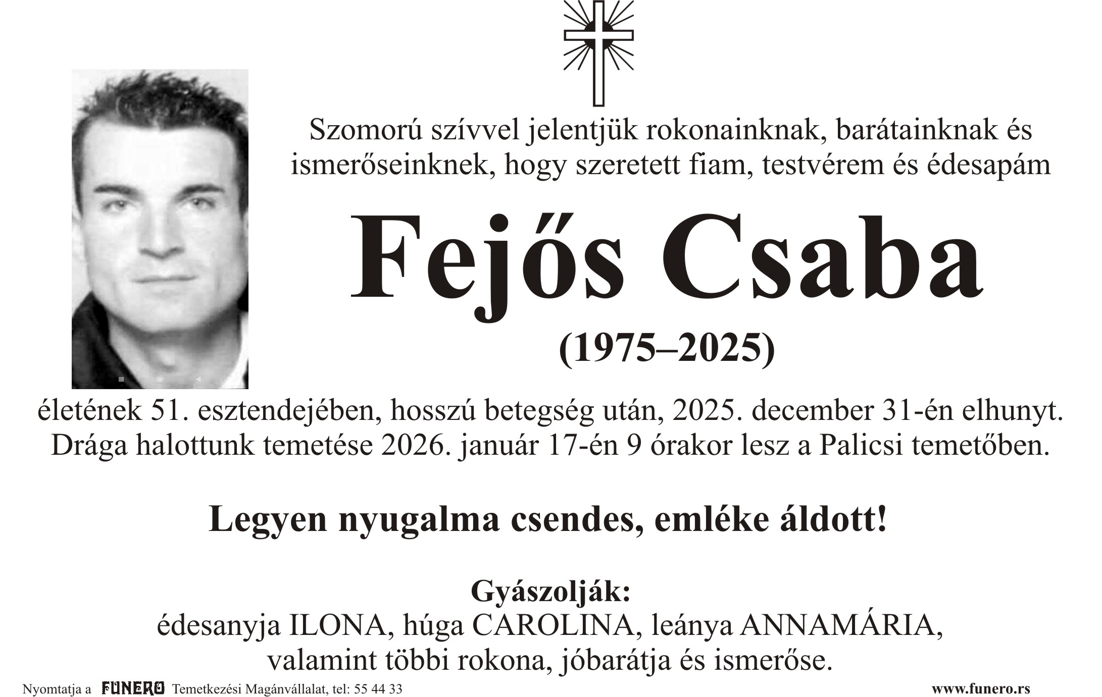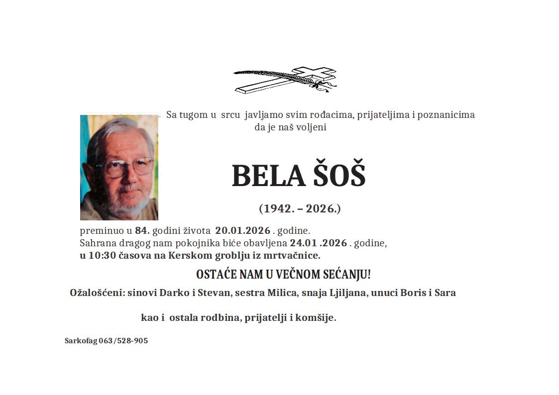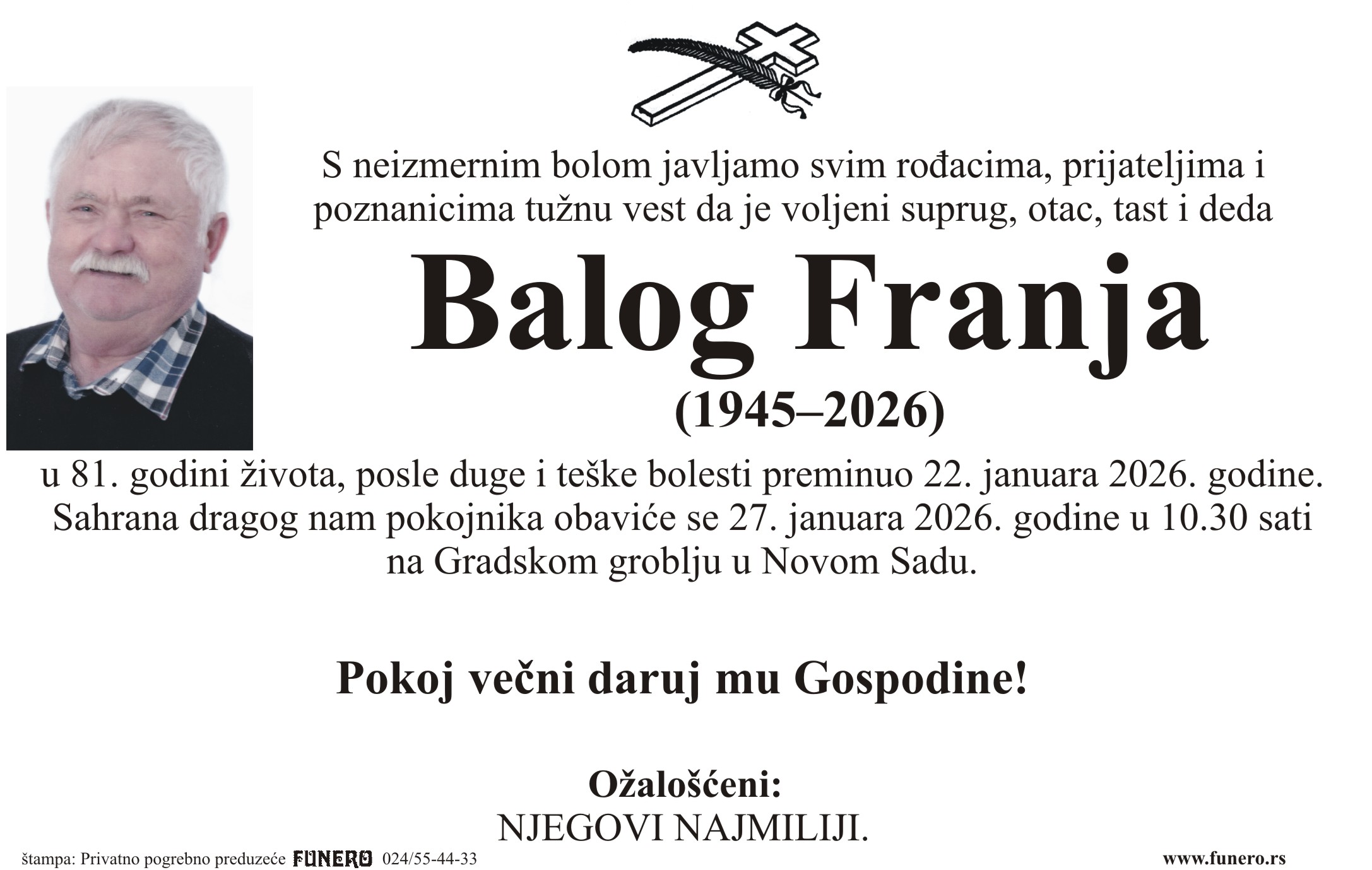 U 81. godini preminuo je Franja Balog iz Šupljaka, iz ulice Arpada Kostolanjija. Sahrana je 27. januara u 10 sati i 30 minuta na Gradskom groblju u Novom Sadu.