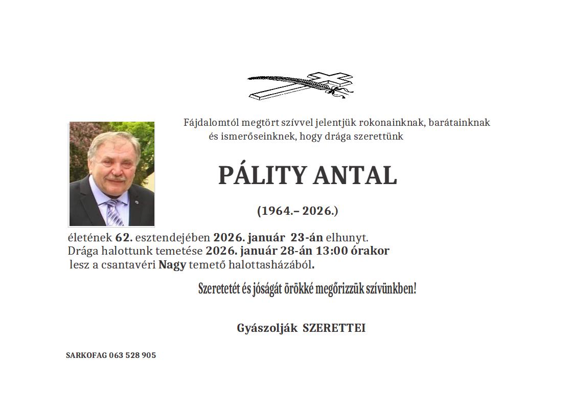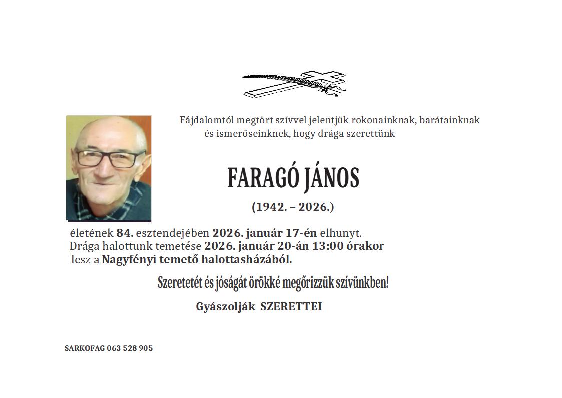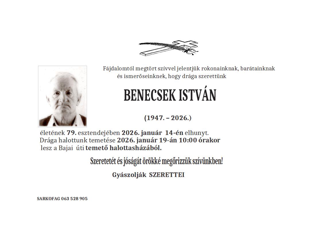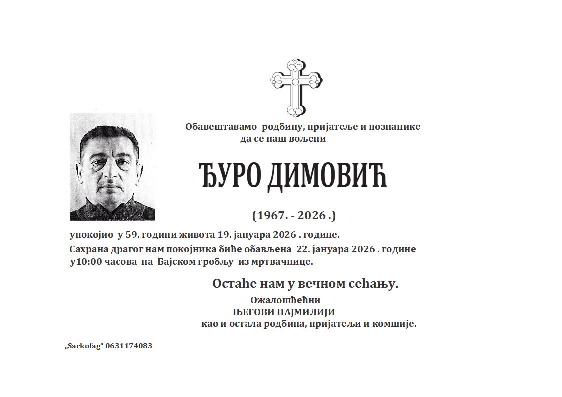 U 81. godini preminuo je Franja Balog iz Šupljaka, iz ulice Arpada Kostolanjija. Sahrana je 27. januara u 10 sati i 30 minuta na Gradskom groblju u Novom Sadu.