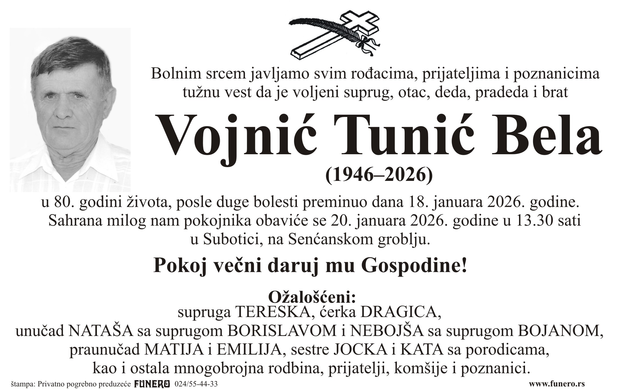 U 80. godini preminuo je Bela Vojnić Tunić iz Subotice, sa Senćanskog puta. Sahrana je 20. januara u 13 sati i 30 minuta na Senćanskom groblju.