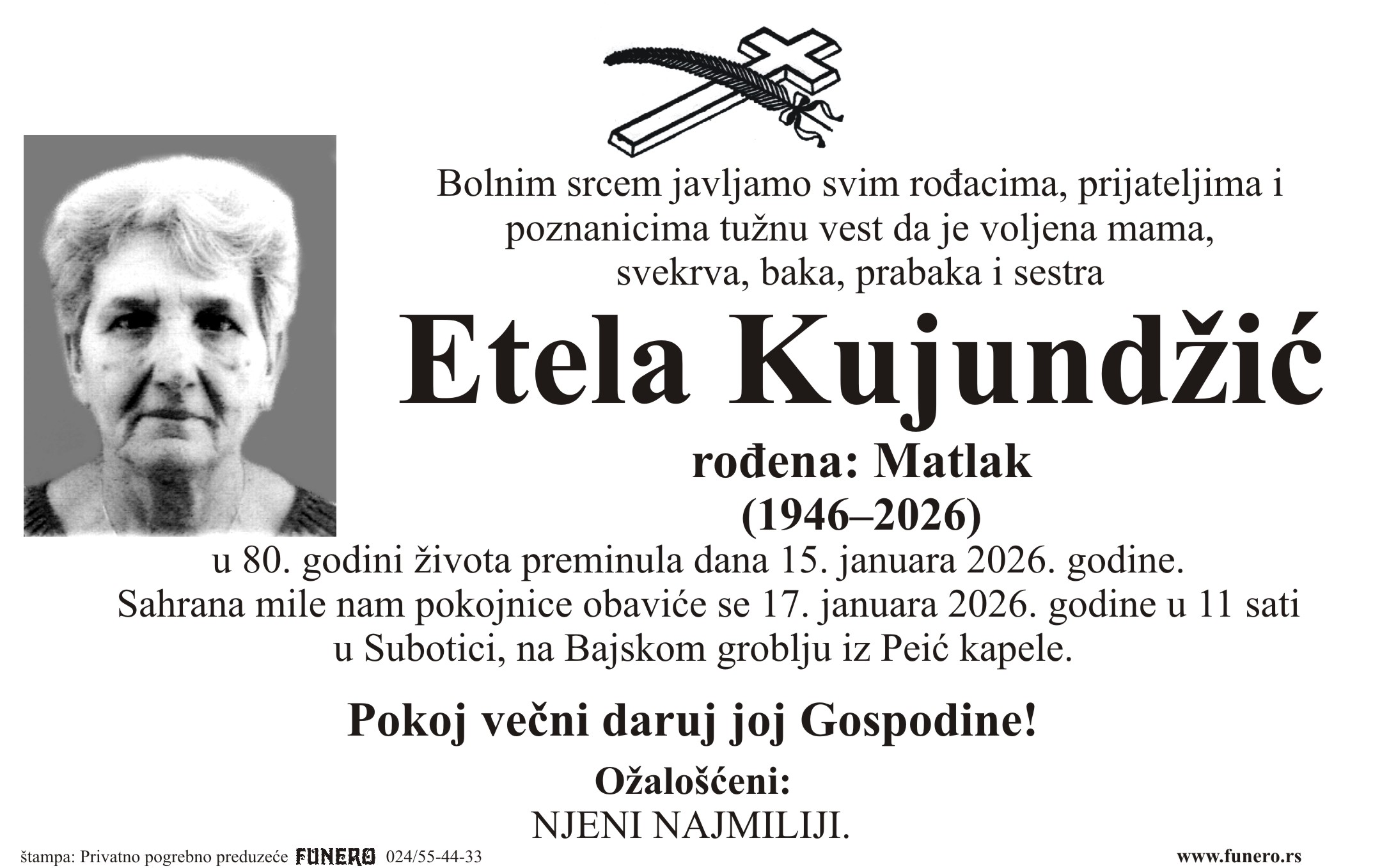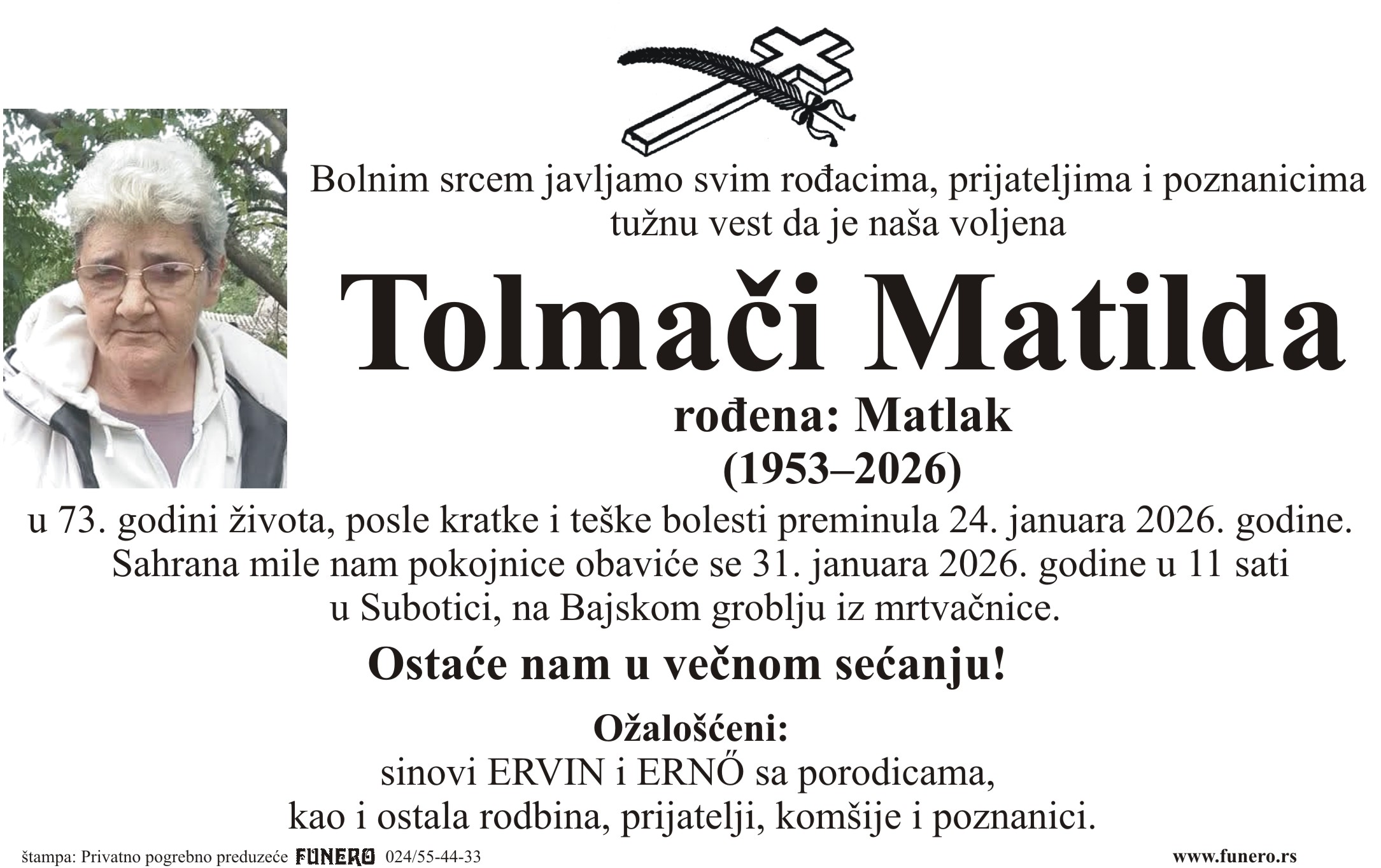 U 73. godini preminula je Matilda Tolmači iz Subotice, iz Erdutske ulice. Sahrana je 31. januara u 11 sati na Bajskom groblju iz mrtvačnice.