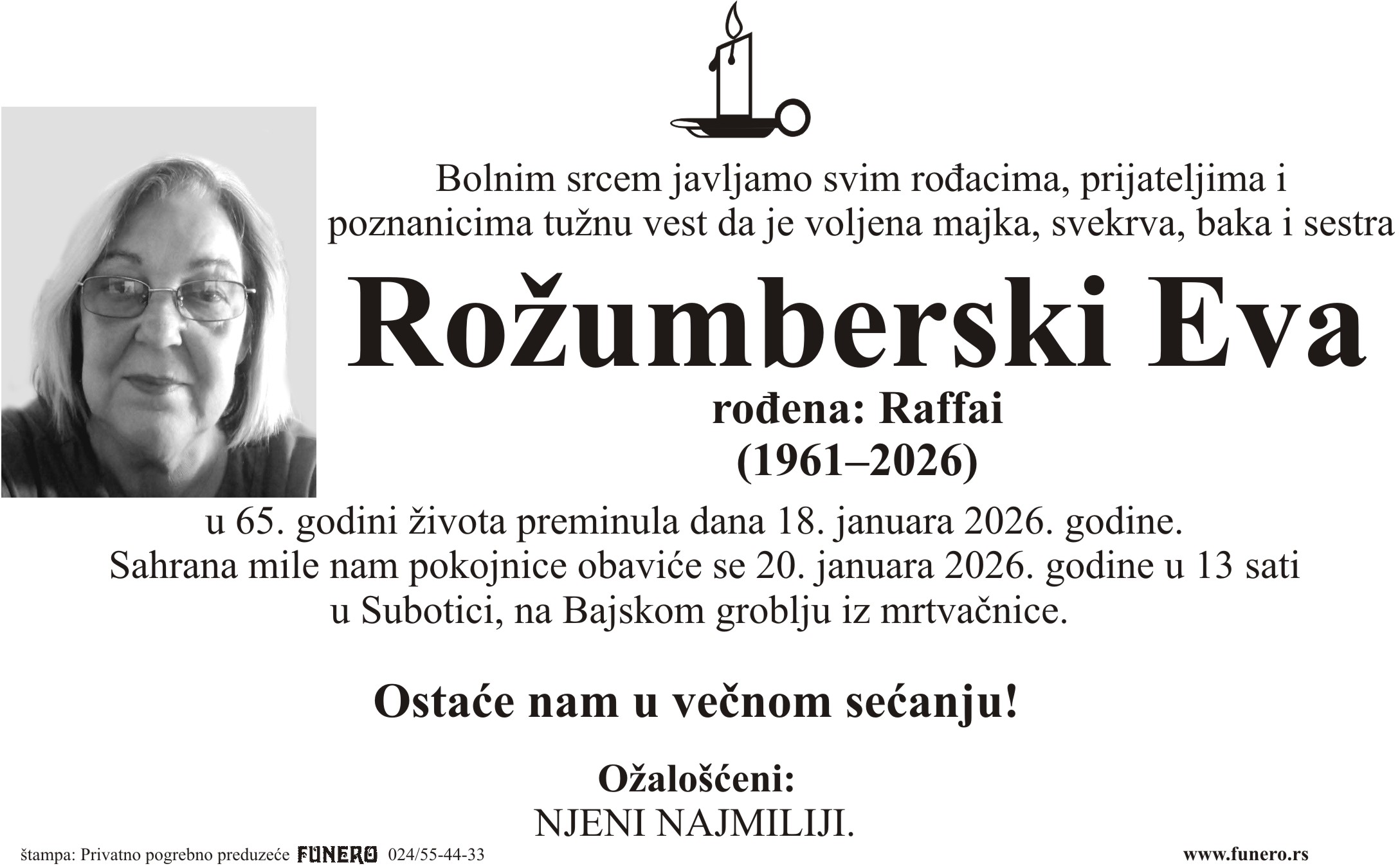 U 65. godini preminula je Eva Rožumberski iz Subotice, iz Karaške ulice. Sahrana je 20. januara u 13 sati na Bajskom groblju iz mrtvačnice.