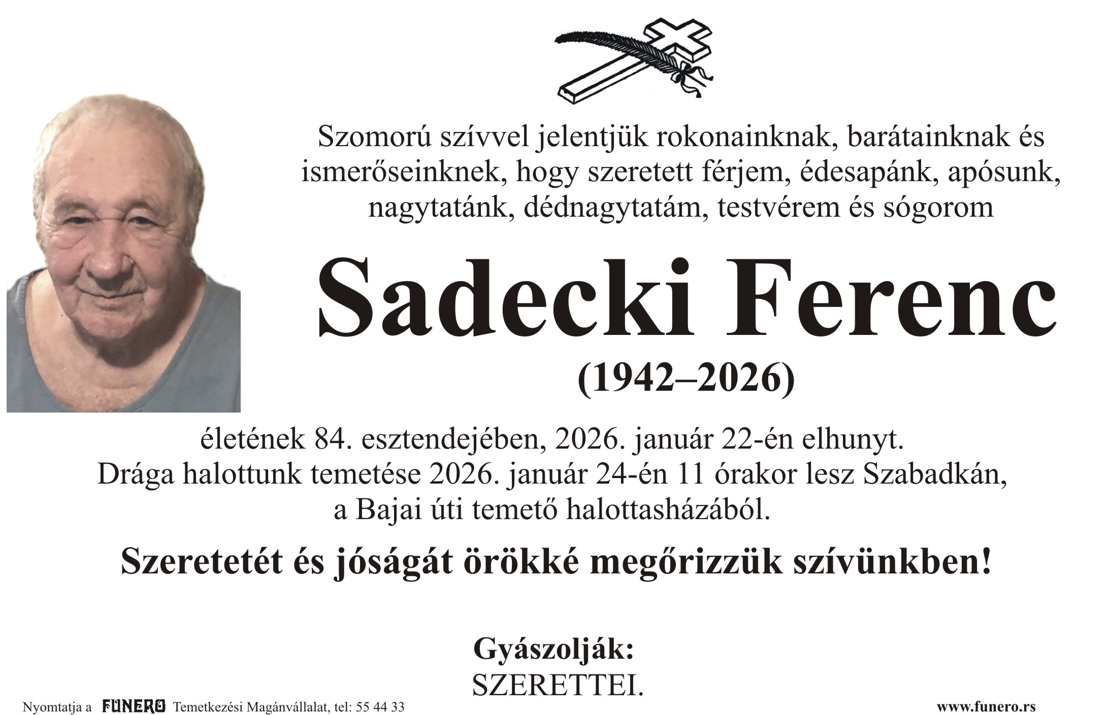 U 84. godini preminuo je Ferenc Sadecki iz Subotice, iz Koparske ulice. Sahrana je 24. januara u 11 sati na Bajskom groblju iz mrtvačnice.