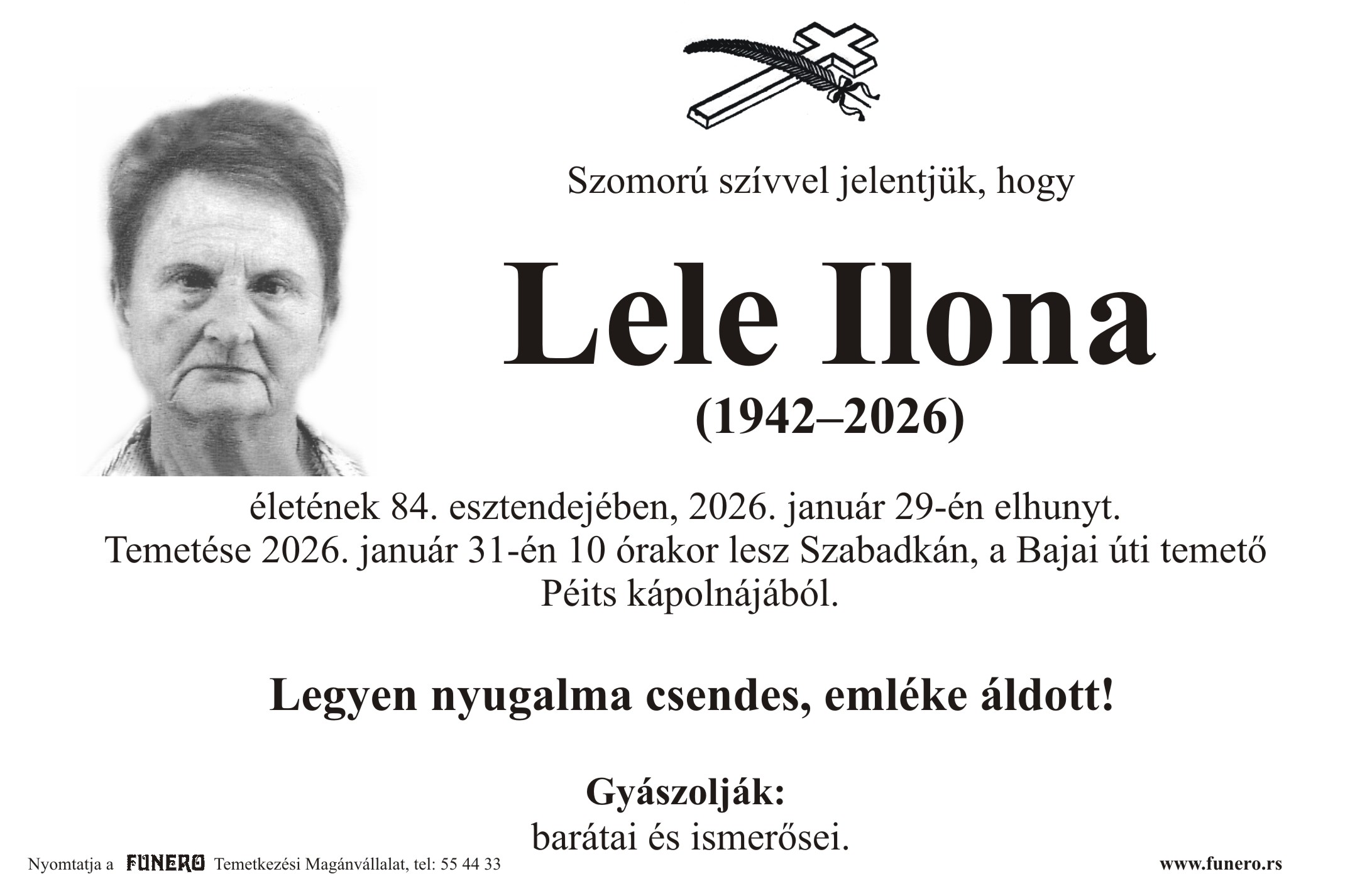 U 84. godini preminula je Ilona Lele iz Subotice, iz ulice Ferenca Kiša. Sahrana je 31. januara u 10 sati na Bajskom groblju iz Peić kapele.