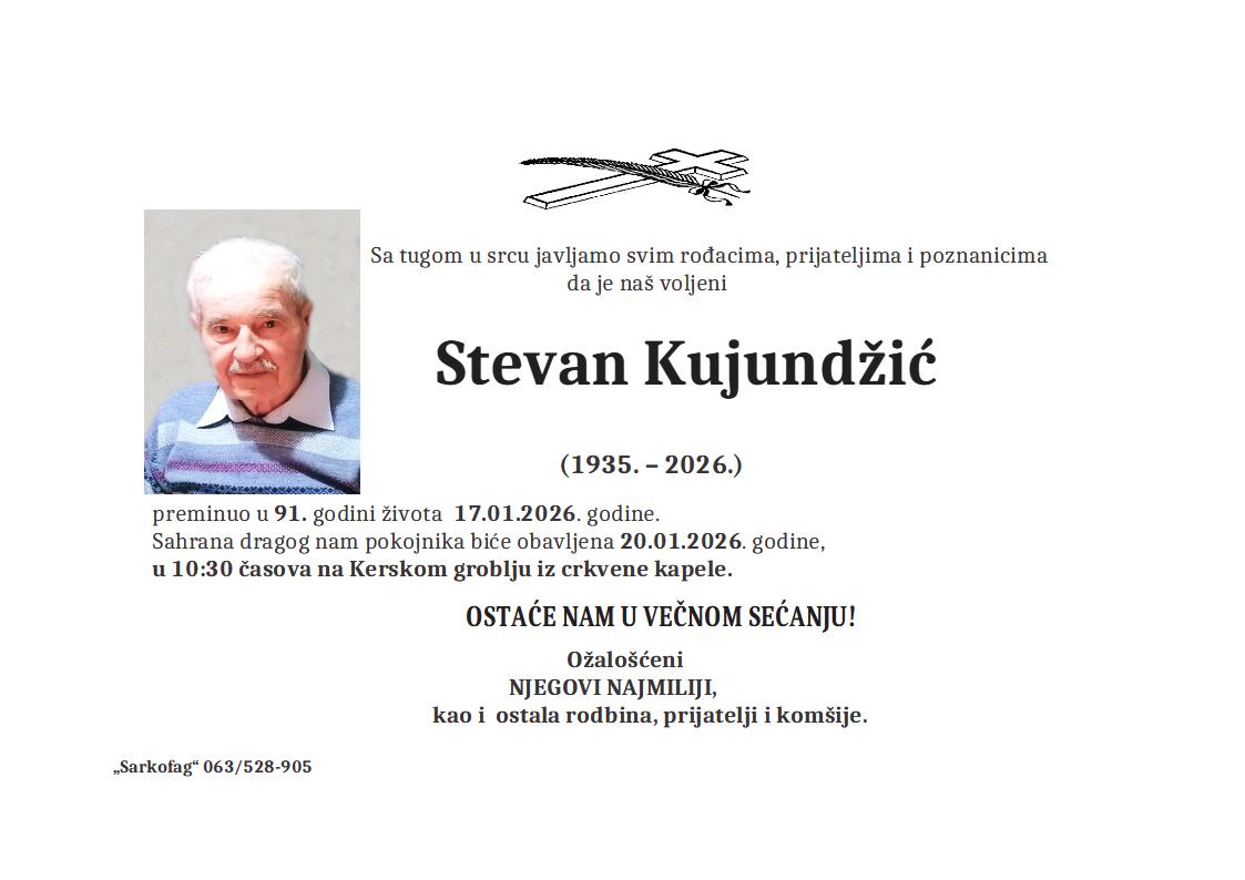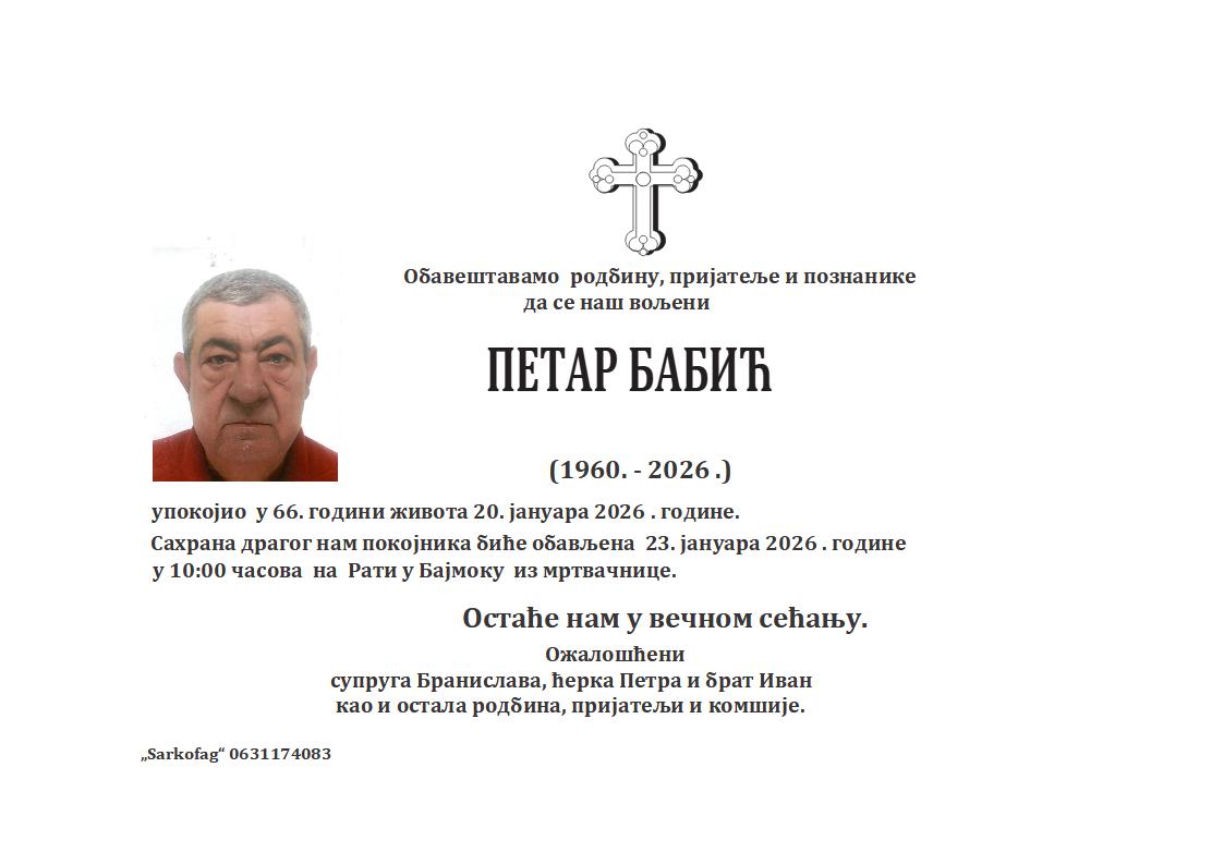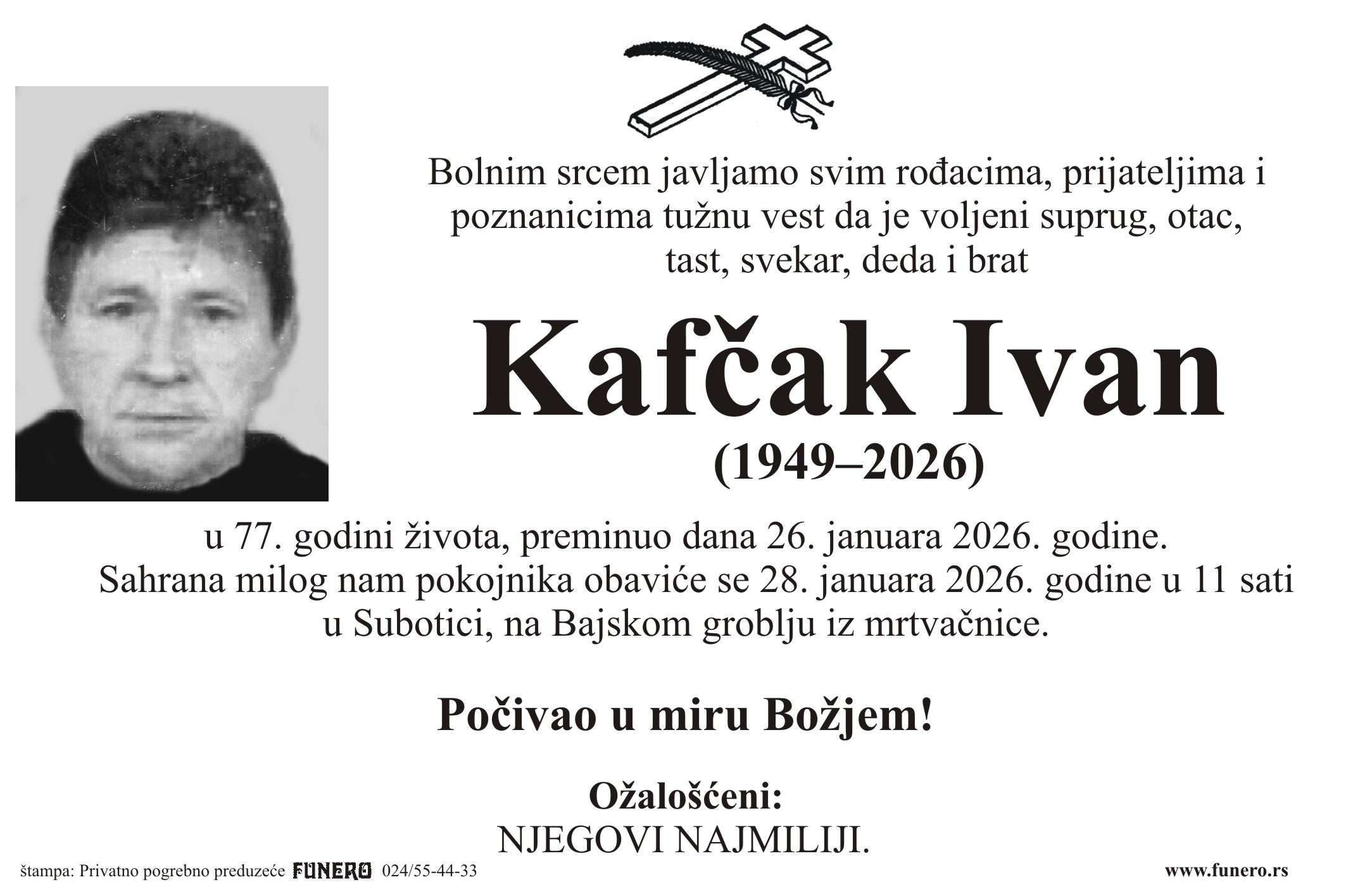 U 77. godini preminuo je Ivan Kafčak iz Subotice, iz ulice Rolana Romena. Sahrana je 28. januara u 11 sati na Bajskom groblju iz mrtvačnice.