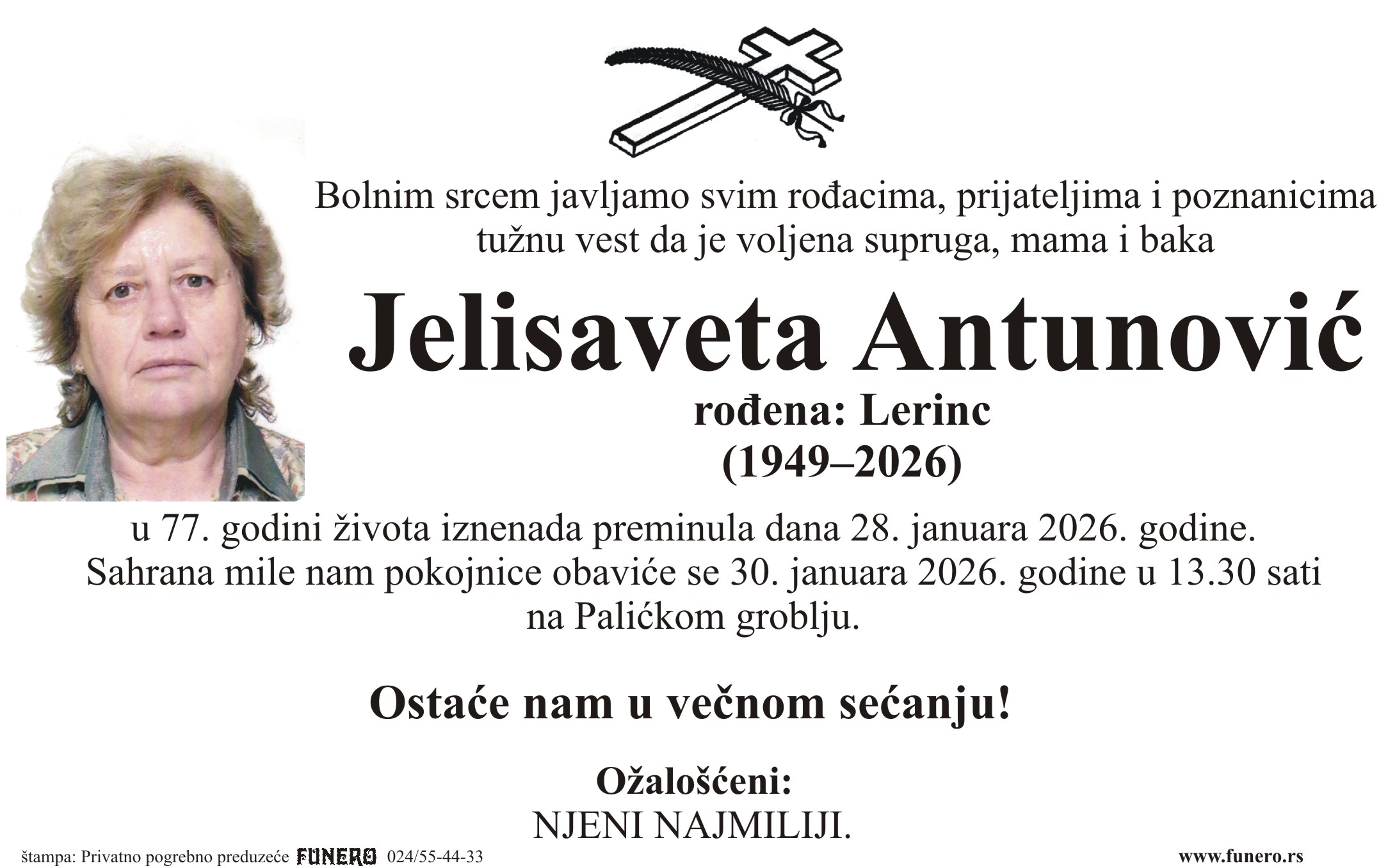 U 77. godini preminula je Jelisaveta Antunović sa Palića, iz Sutjeske ulice. Sahrana je 30. januara u 13 sati i 30 minuta na Palićkom groblju.
