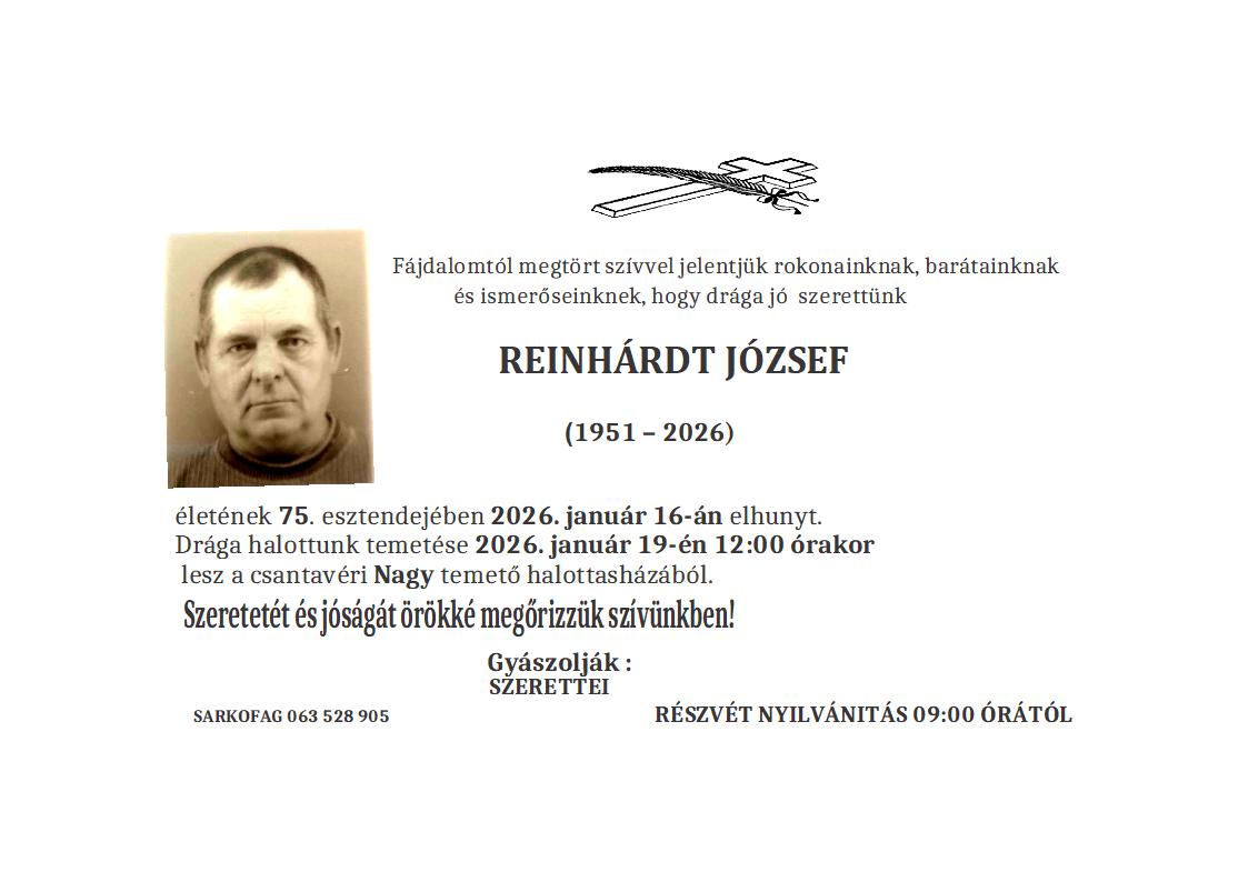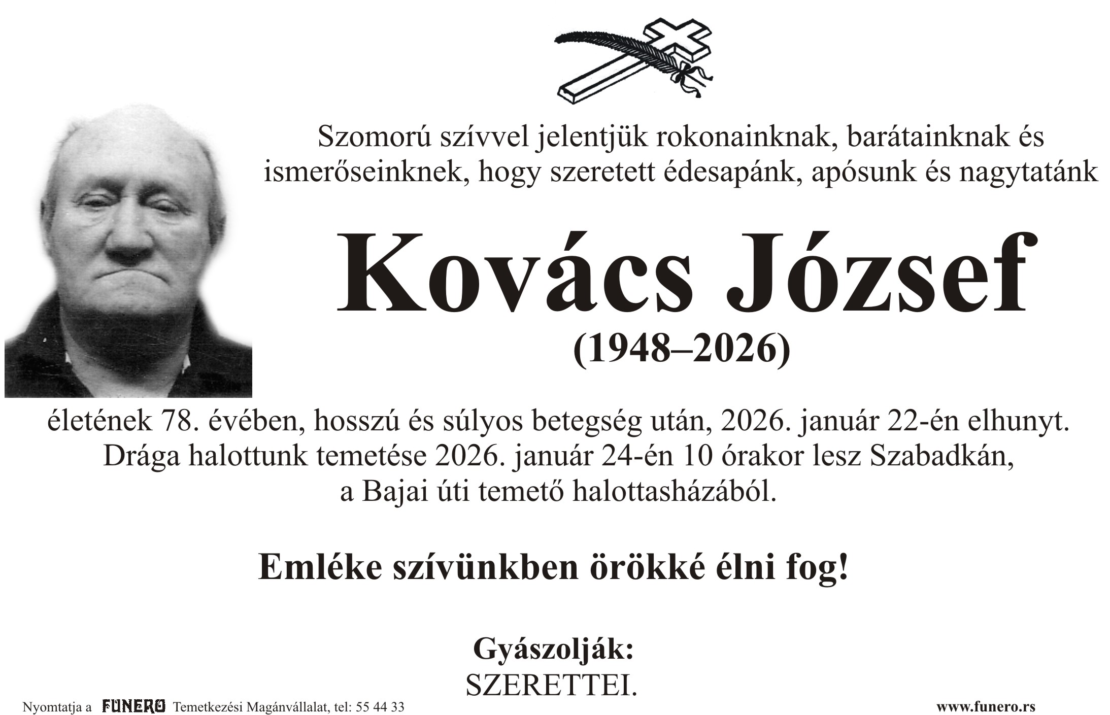 U 78. godini preminuo je Jožef Kovač iz Subotice, iz Krfske ulice. Sahrana je 24. januara u 10 sati na Bajskom groblju iz mrtvačnice.