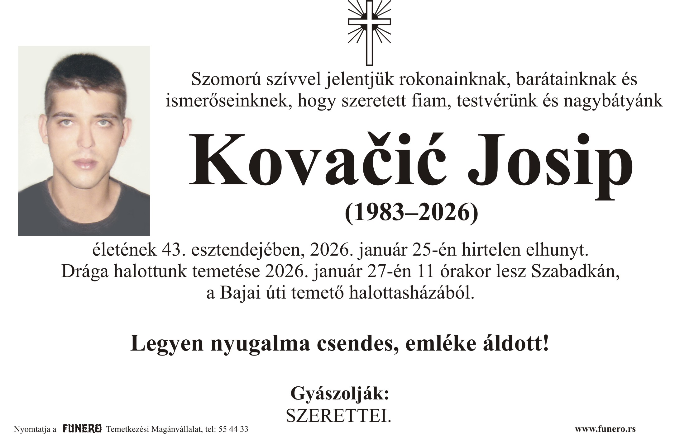 U 43. godini preminuo je Josip Kovačić iz Subotice, iz ulice Petra Popovića Age. Sahrana je 27. januara u 11 sati na Bajskom groblju iz mrtvačnice.