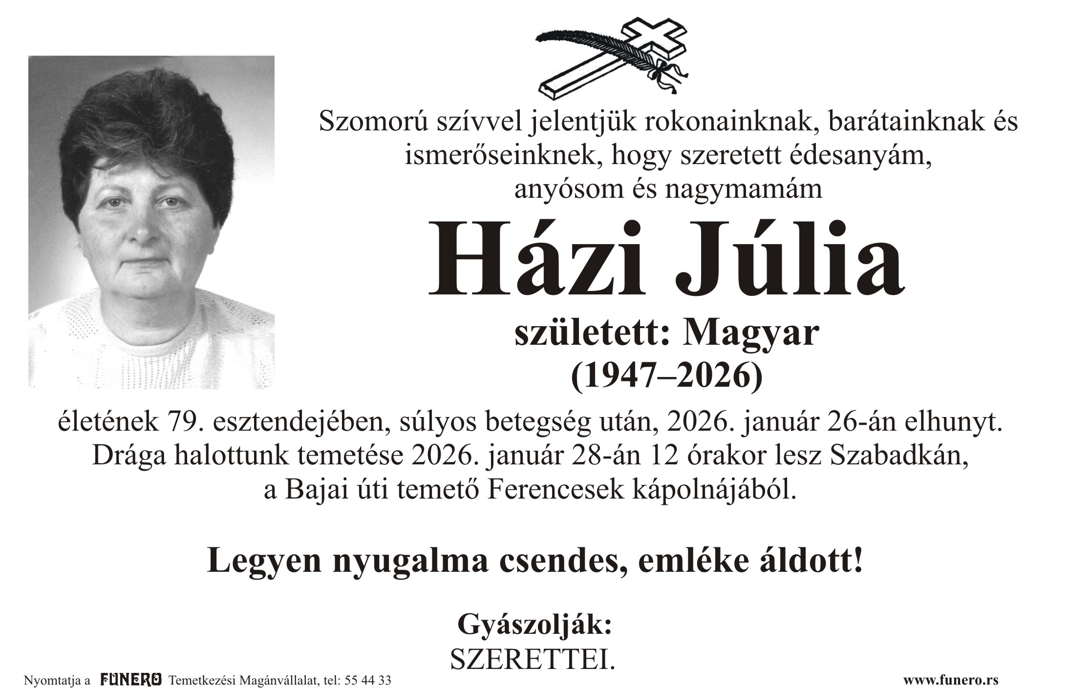 U 79. godini preminula je Julia Hazi iz Subotice. Sahrana je 28. januara u 12 sati na Bajskom groblju iz Franjevačke kapele.
