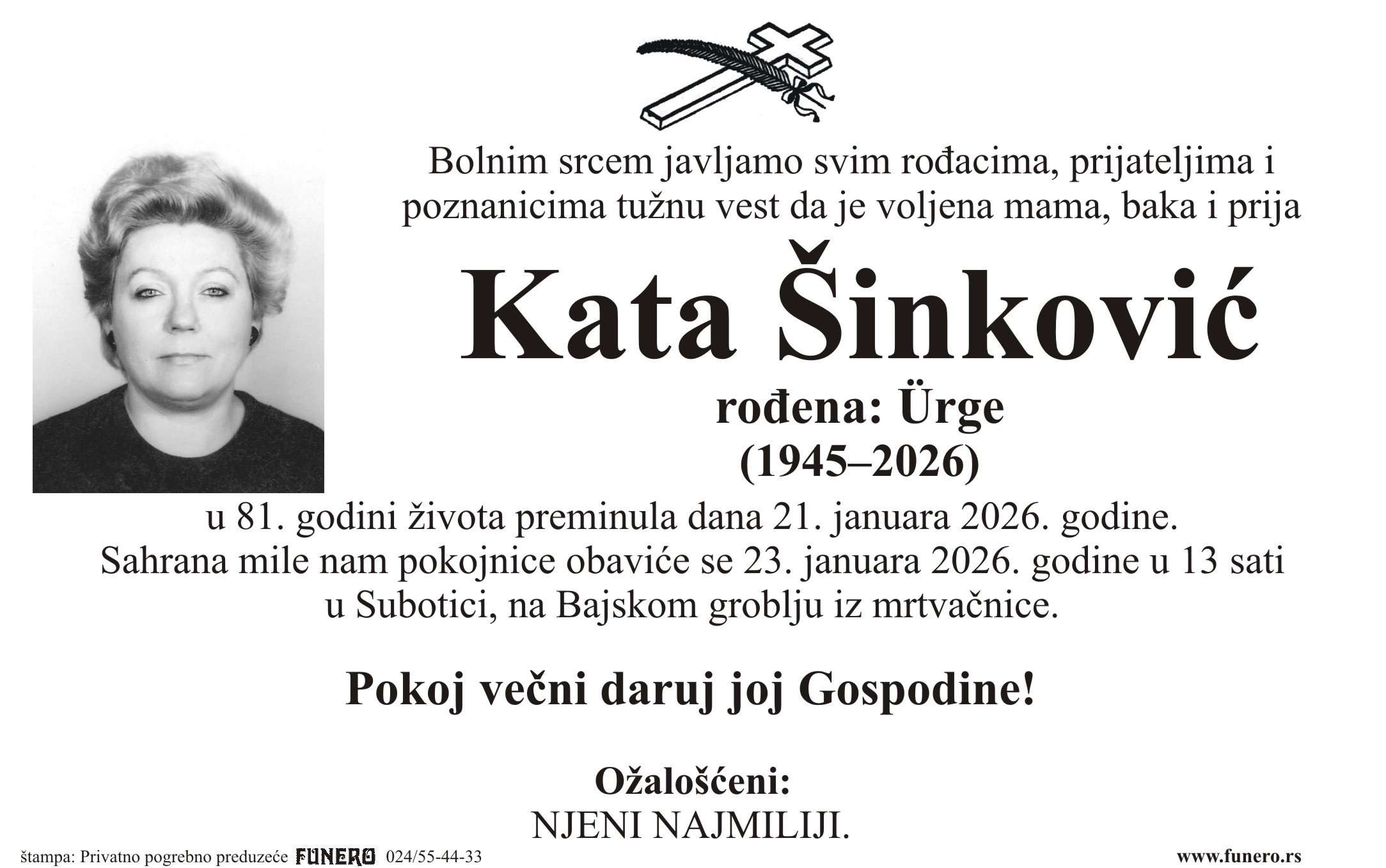 U 81. godini preminula je Kata Šinković iz Subotice, iz Erdutske ulice. Sahrana je 23. januara u 13 sati na Bajskom groblju iz mrtvačnice.