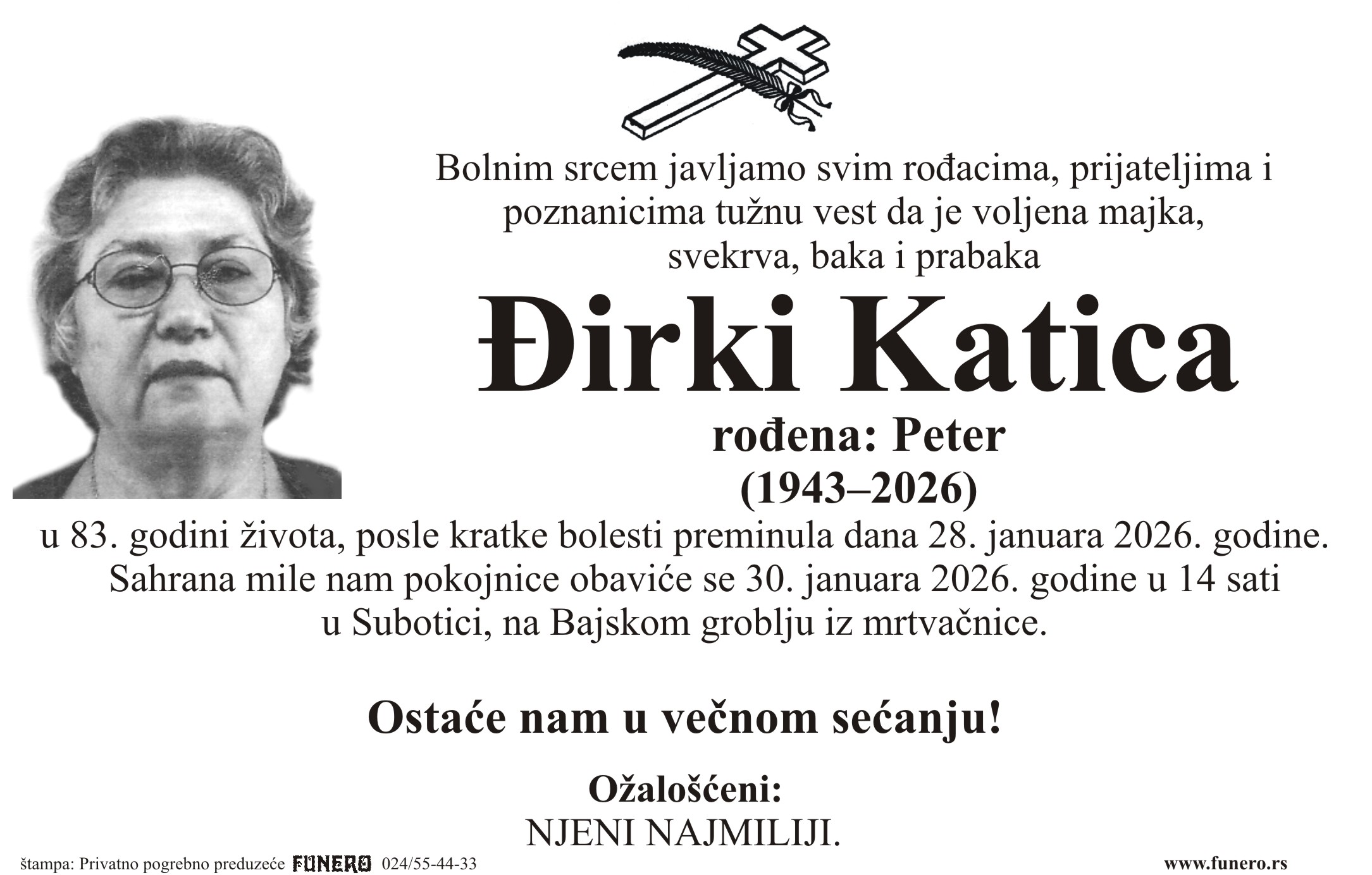 U 82. godini preminula je Katica Đirki iz Subotice, iz ulice Bele Kuna. Sahrana je 30. januara u 14 sati na Bajskom groblju iz mrtvačnice.