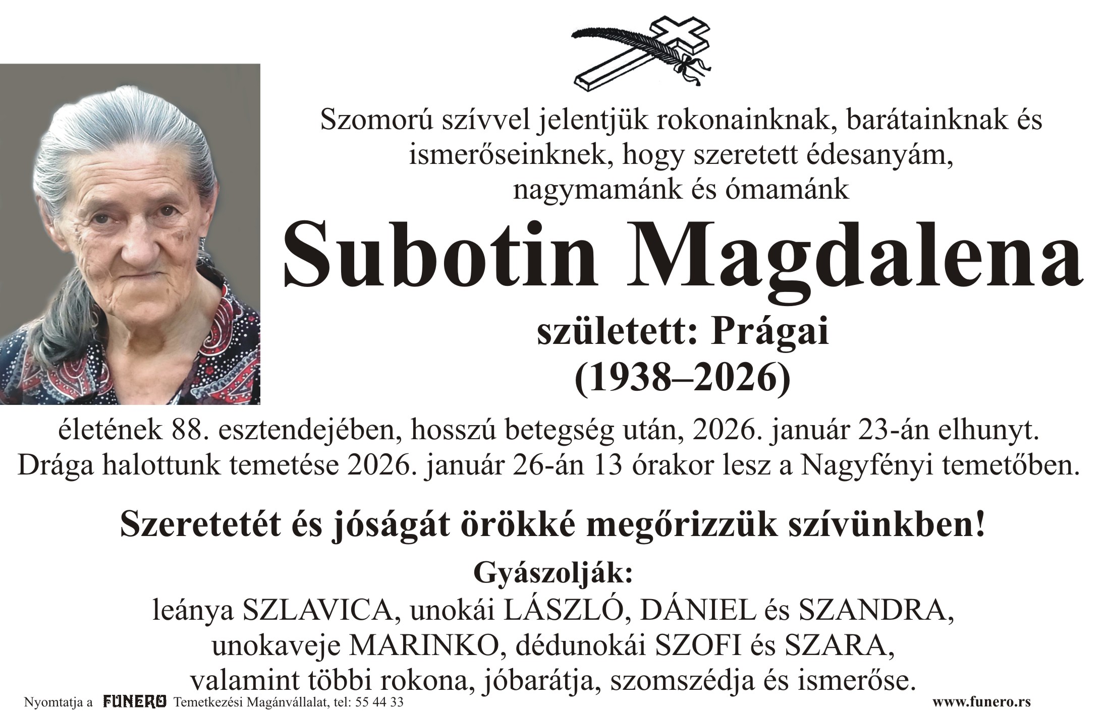 U 88. godini preminula je Magdalena Subotin iz Starog Žednika, iz Prvomajske ulice. Sahrana je 26. januara u 13 sati na groblju u Starom Žedniku.