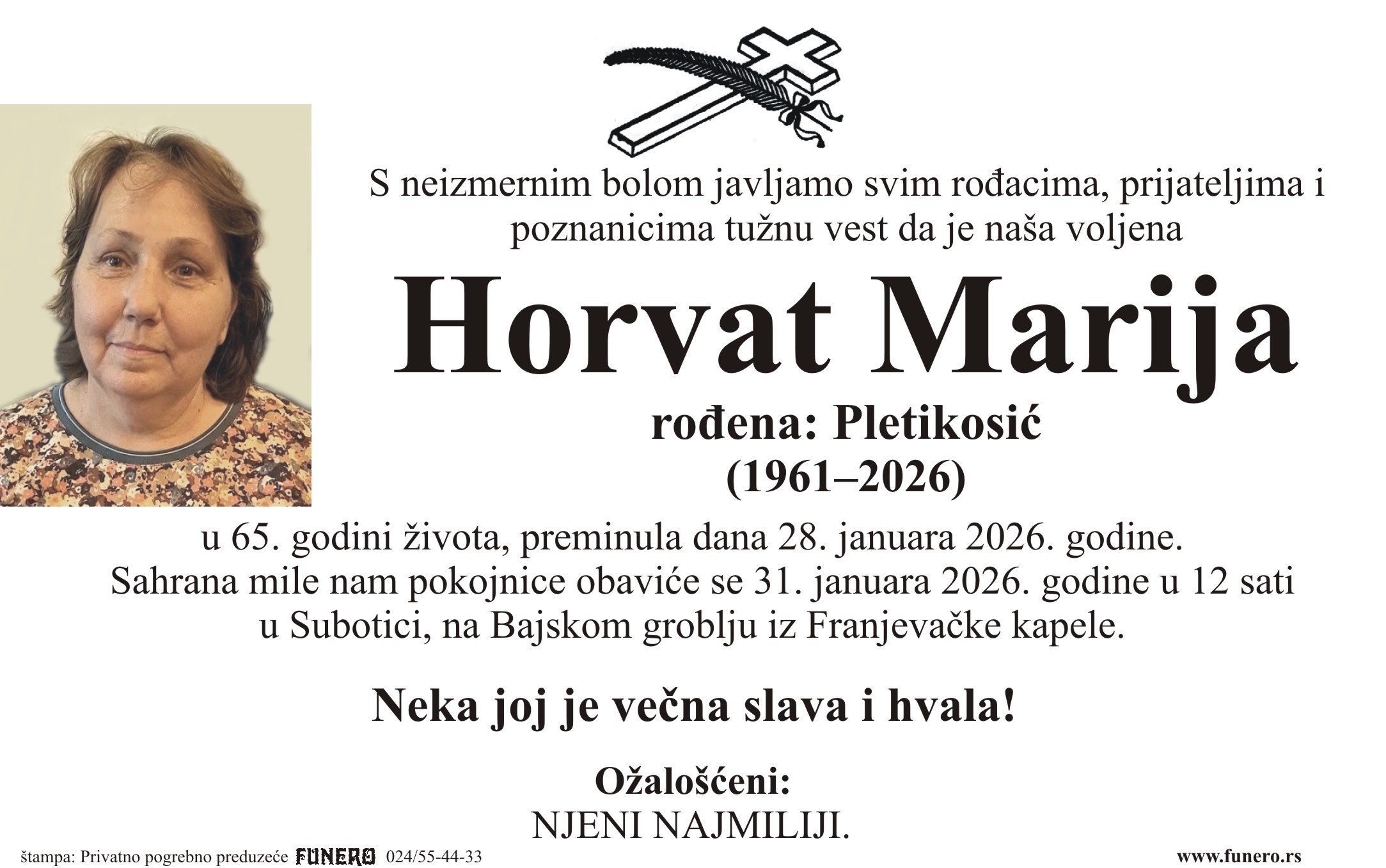 U 65. godini preminula je Marija Horvat iz Subotice, iz Bregalničke ulice. Sahrana je 31. januara u 12 sati na Bajskom groblju iz Franjevačke kapele.