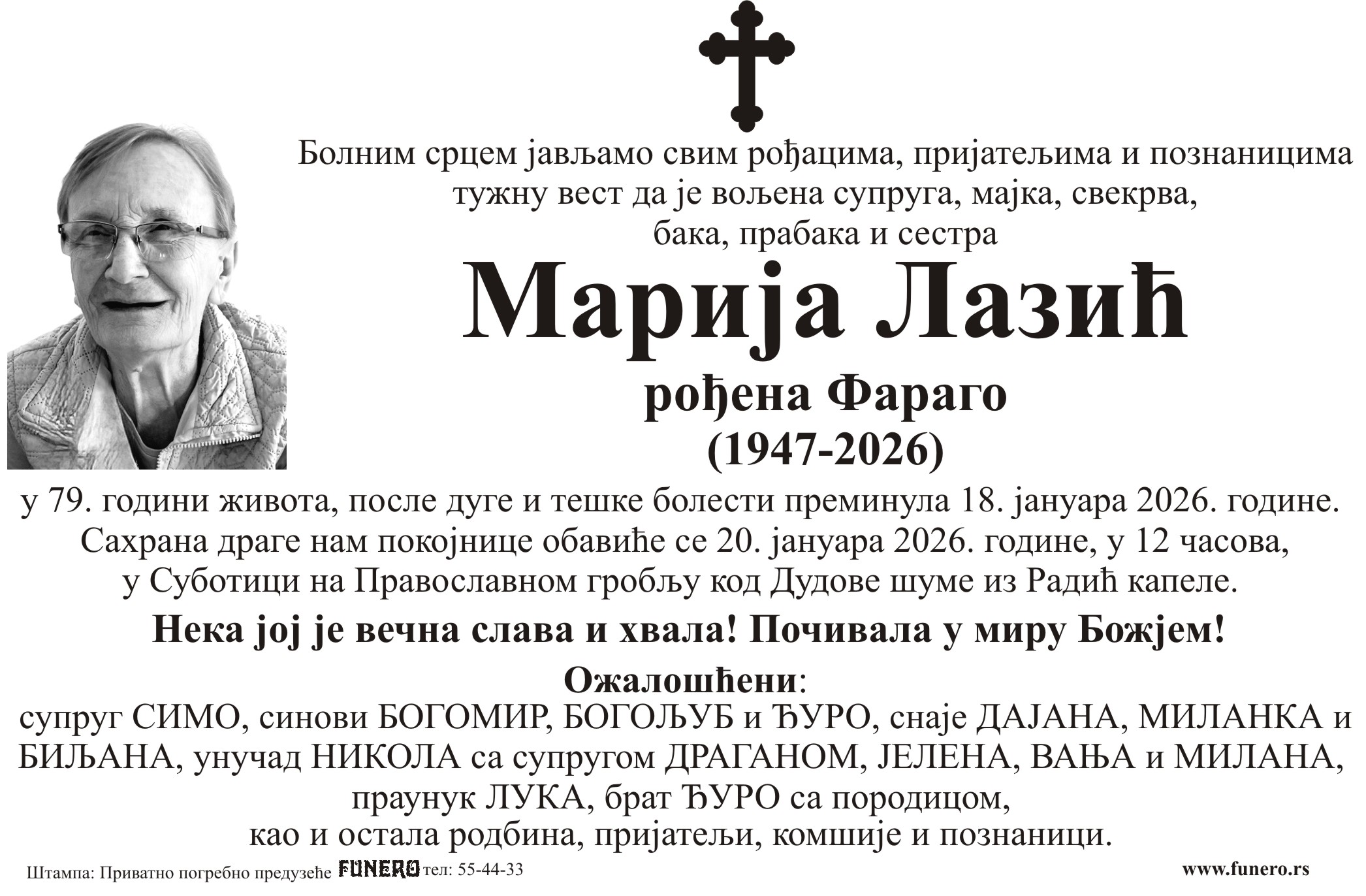 U 79. godini preminula je Marija Lazić iz Subotice, iz ulice 8. Marta. Sahrana je 20. januara u 12 časova na Pravoslavnom groblju kod Dudove šume iz Radić kapele.