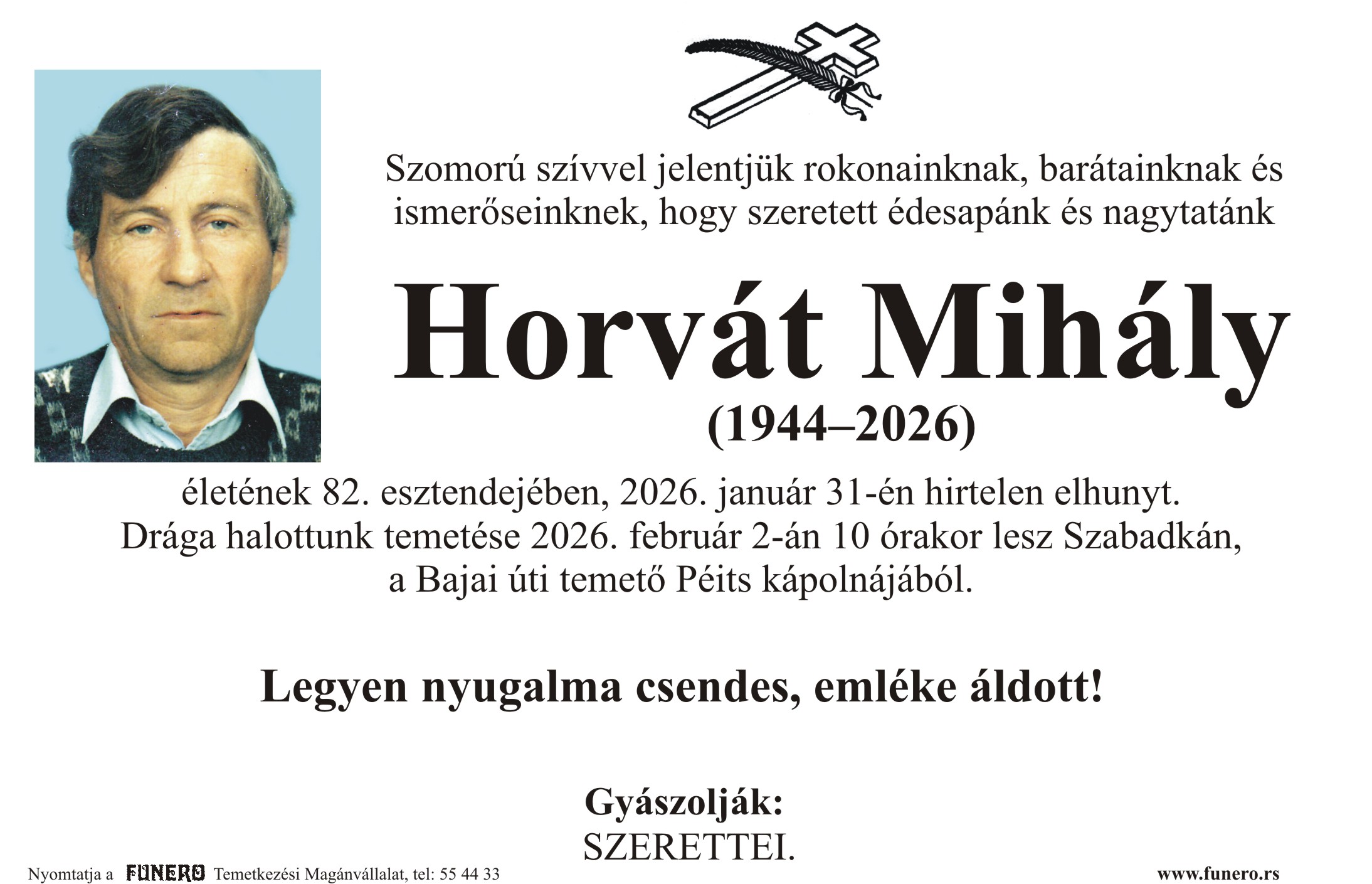 U 82. godini preminuo je Mihalj Horvat iz Subotice, sa Puta Edvarda Kardelja. Sahrana je 2. februara u 10 sati na Bajskom groblju iz Peić kapele.