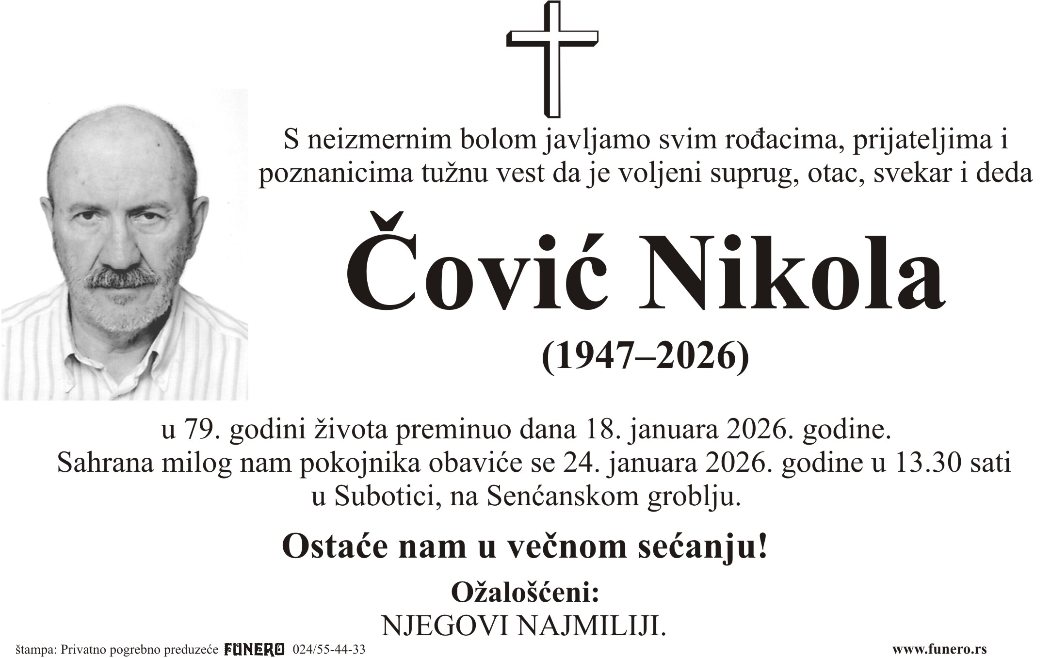 U 79. godini preminuo je Nikola Čović iz Subotice, iz Prvomajske ulice. Sahrana je 24. januara u 13 sati i 30 minuta na Senćanskom groblju.