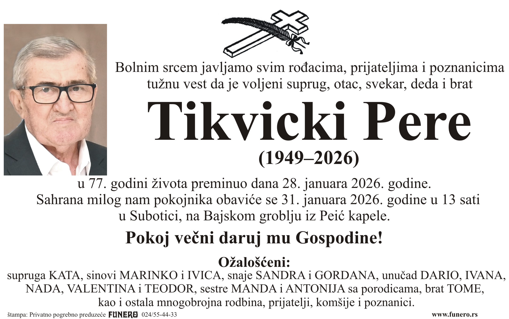U 77. godini preminuo je Pere Tikvicki iz Male Bosne, iz ulice Vladimira Nazora. Sahrana je 31. januara u 13 sati na Bajskom groblju iz Peić kapele.