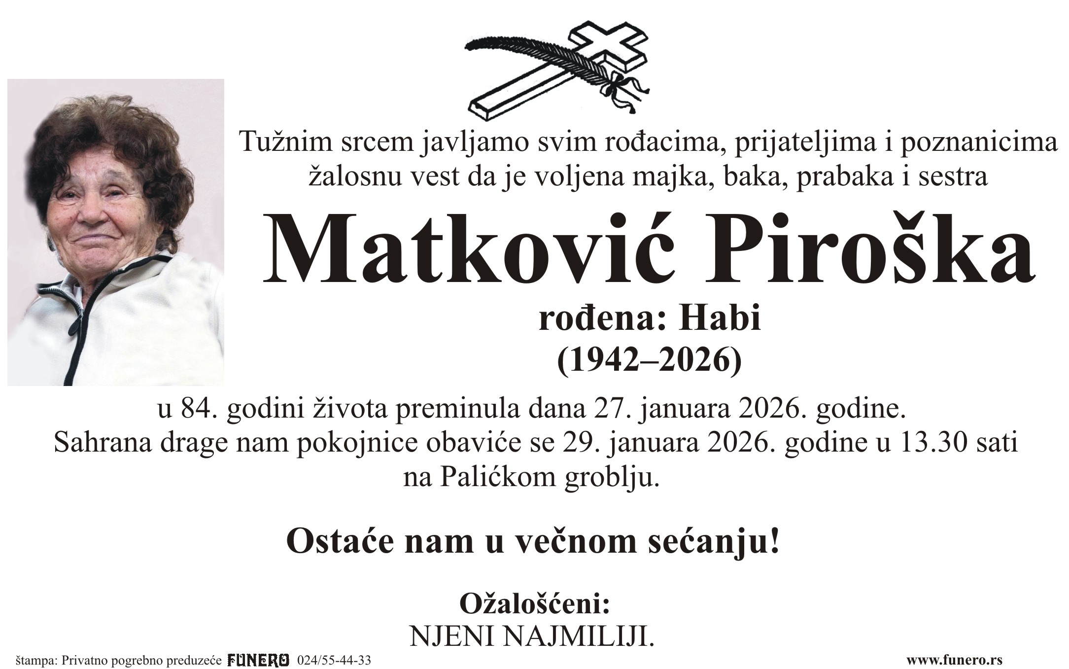 U 84. godini preminula je Piroška Matković sa Palića, iz Parka fizičke kulture. Sahrana je 29. januara u 13 sati i 30 minuta na Palićkom groblju.