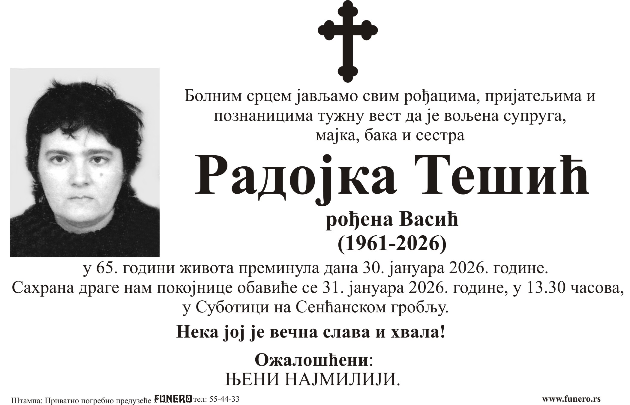 U 65. godini preminula je Radojka Tešić iz Subotice, iz ulice Lajoša Joa. Sahrana je 31. januara u 13 časova i 30 minuta na Senćanskom groblju.