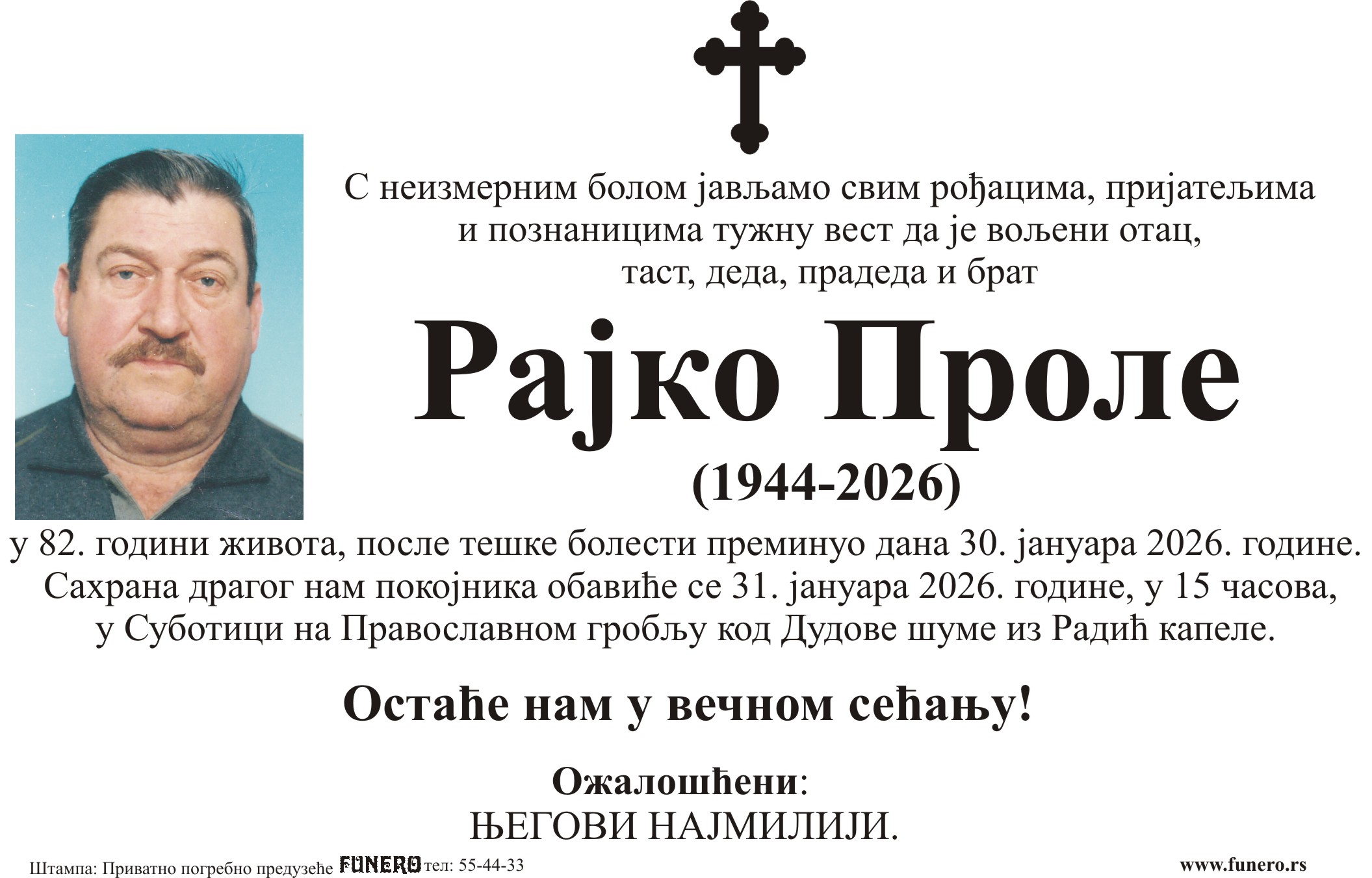 U 82. godini preminuo je Rajko Prole iz Subotice. Sahrana je 31. januara u 15 časova na Pravoslavnom groblju kod Dudove šume iz Radić kapele.