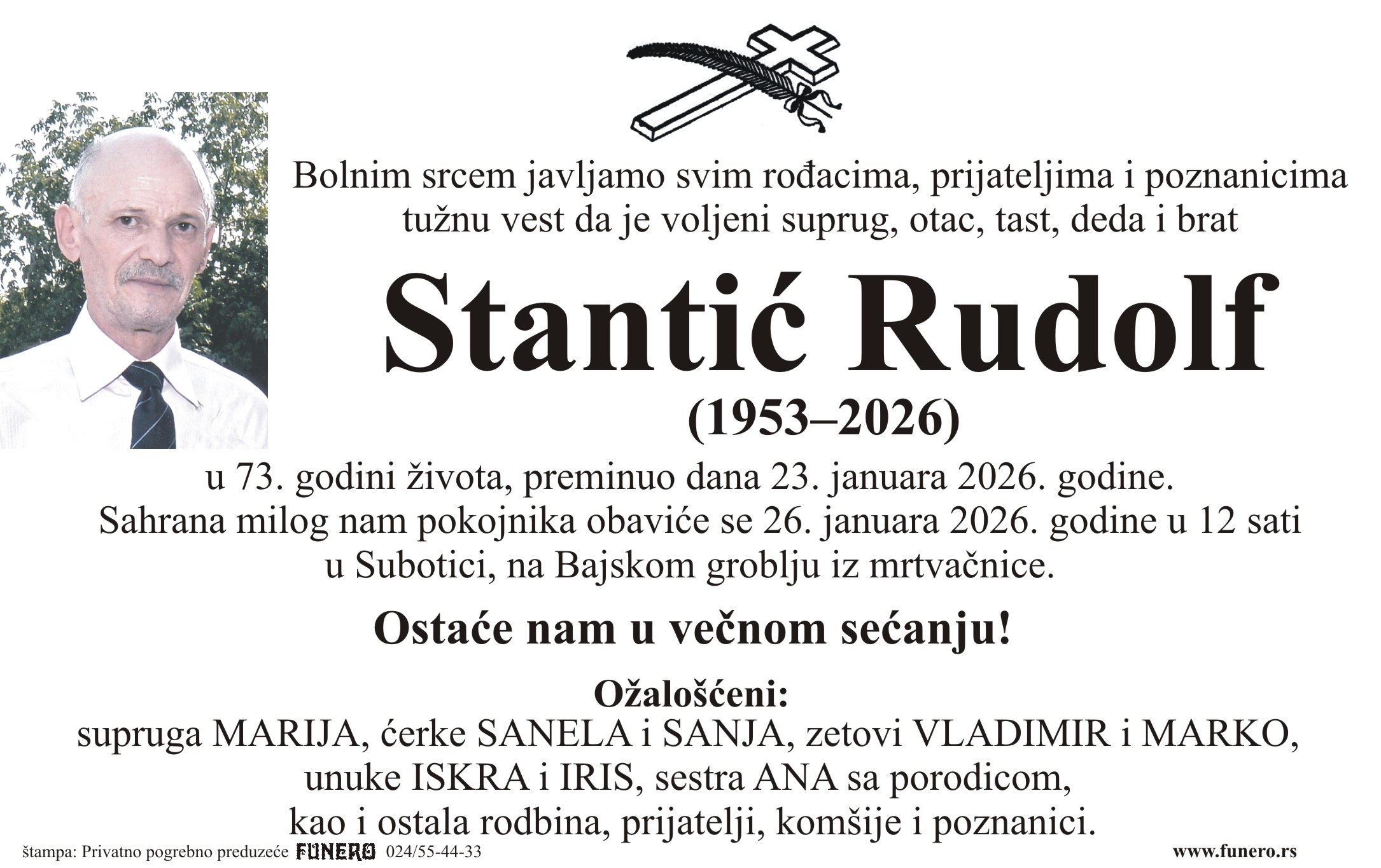 U 73. godini preminuo je Rudolf Stantić iz Subotice, iz Skenderbegove ulice. Sahrana je 26. januara u 12 sati na Bajskom groblju iz mrtvačnice.