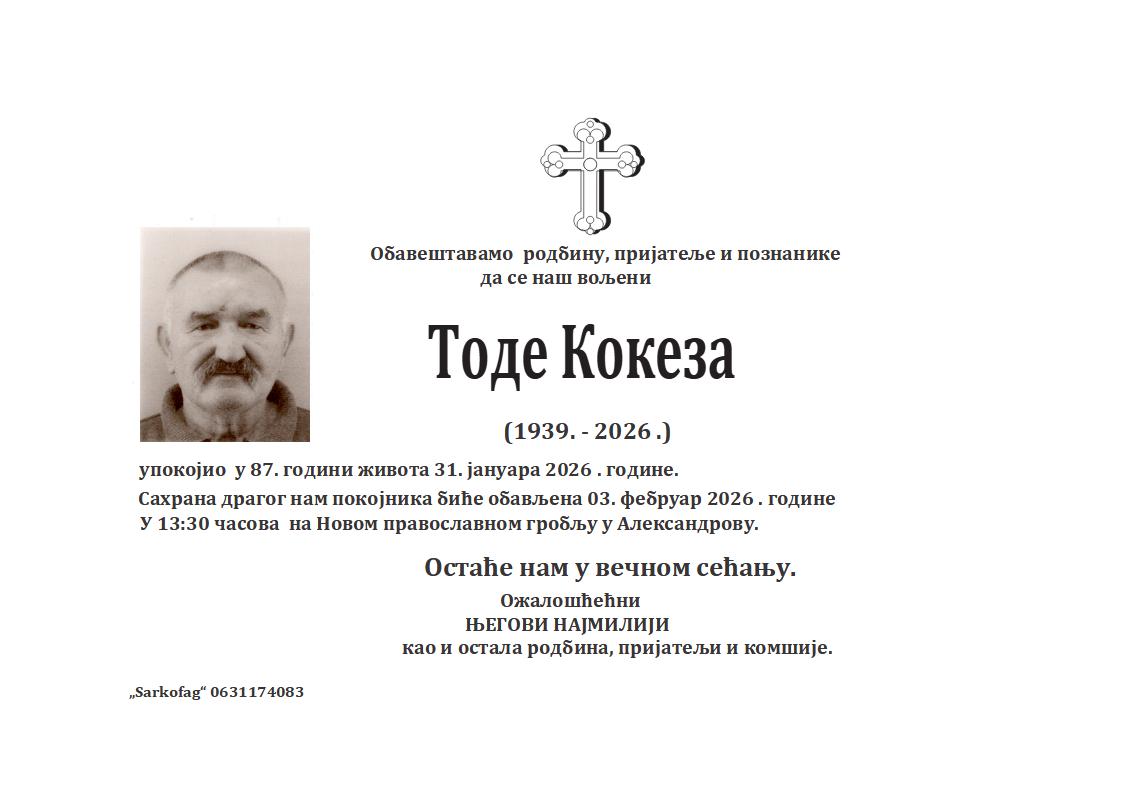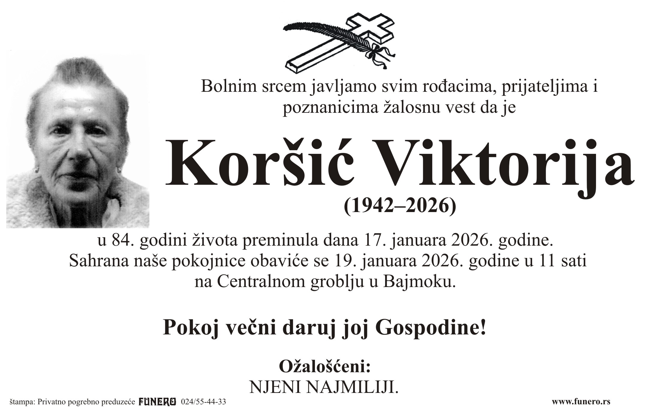 preminula u 83. godini života 02. februara 2026. godine. Sahrana drage nam pokojnice biće obavljena 04. februara 2026. godine, u 13 časova na groblju u Starom Zedniku iz mrtvačnice.