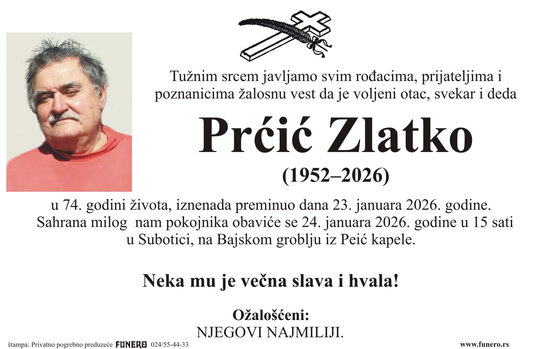 U 74. godini preminuo je Zlatko Prćić iz Subotice. Sahrana je 24. januara u 15 sati na Bajskom groblju iz Peić kapele.