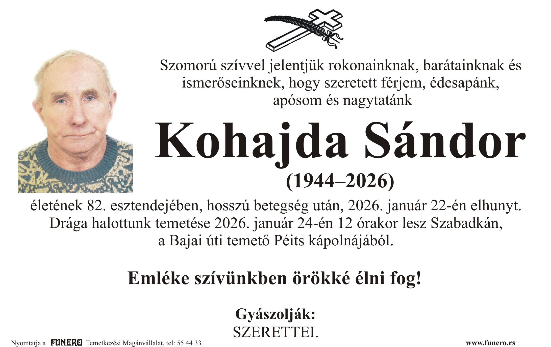 U 82. godini preminuo je Šandor Kohajda iz Subotice, iz Glamočke ulice. Sahrana je 24. januara u 12 sati na Bajskom groblju iz Peić kapele.