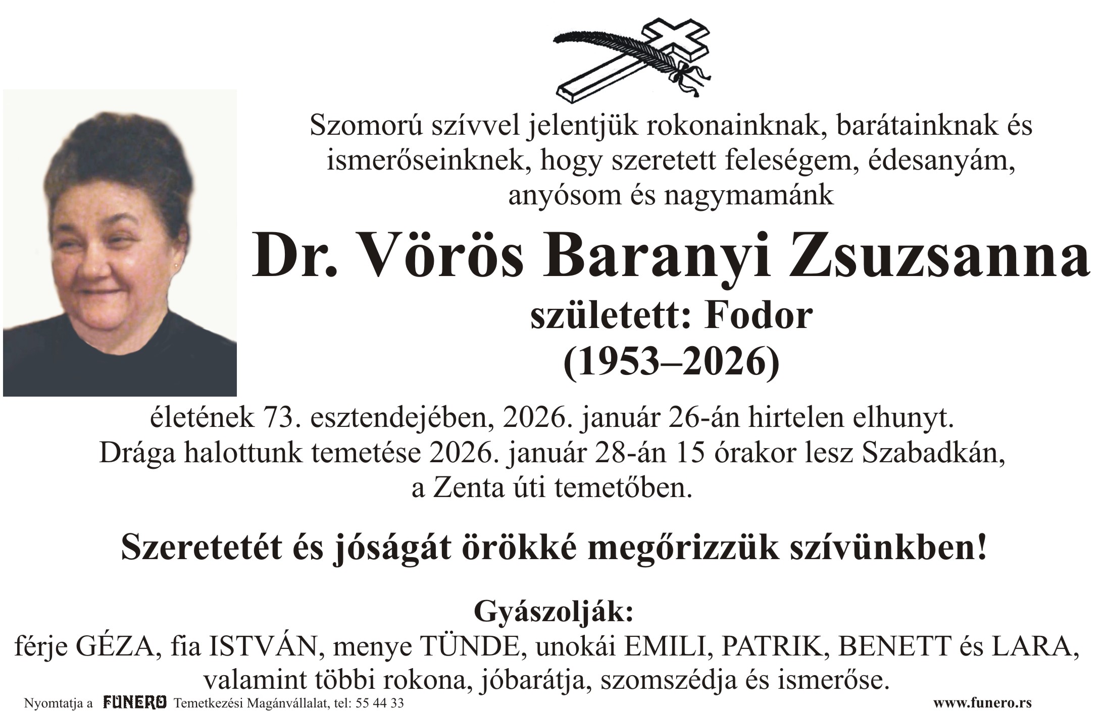 U 73. godini preminuo je dr Žužana Vereš Baranji Fodor iz Subotice, iz ulice Frederika Šopena. Sahrana je 28. januara u 15 sati na Senćanskom groblju.