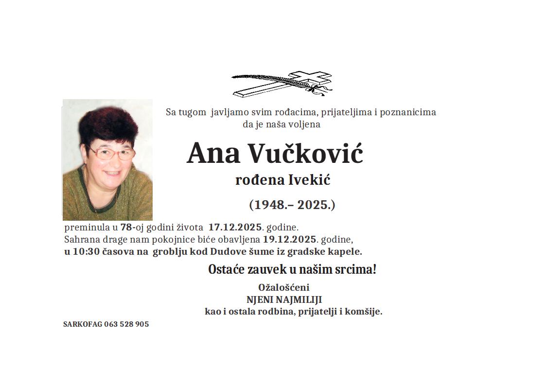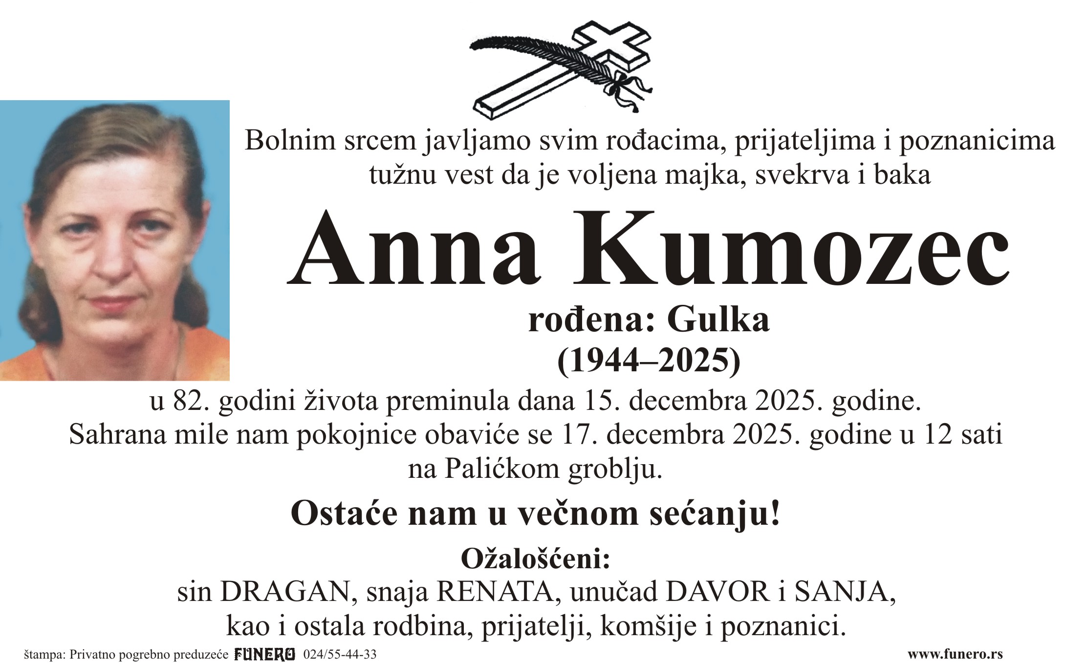 U 81. godini preminula je Anna Kumozec sa Palića, iz Zelengorske ulice. Sahrana je 17. decembra u 12 sati na Palićkom groblju.