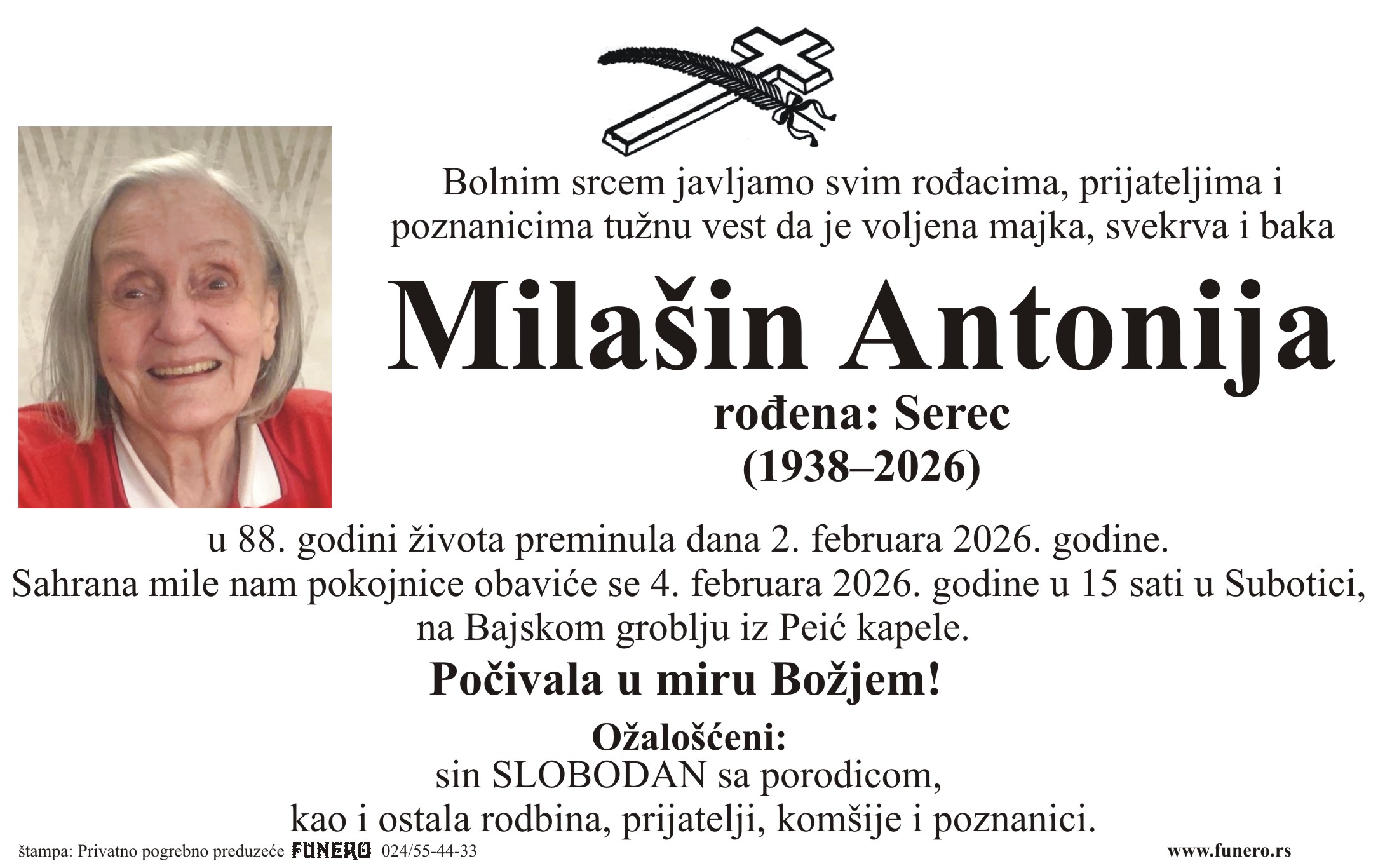 U 88. godini preminula je Antonija Milašin iz Subotice, iz ulice Arsenija Čarnojevića. Sahrana je 4. februara u 15 sati na Bajskom groblju iz Peić kapele.