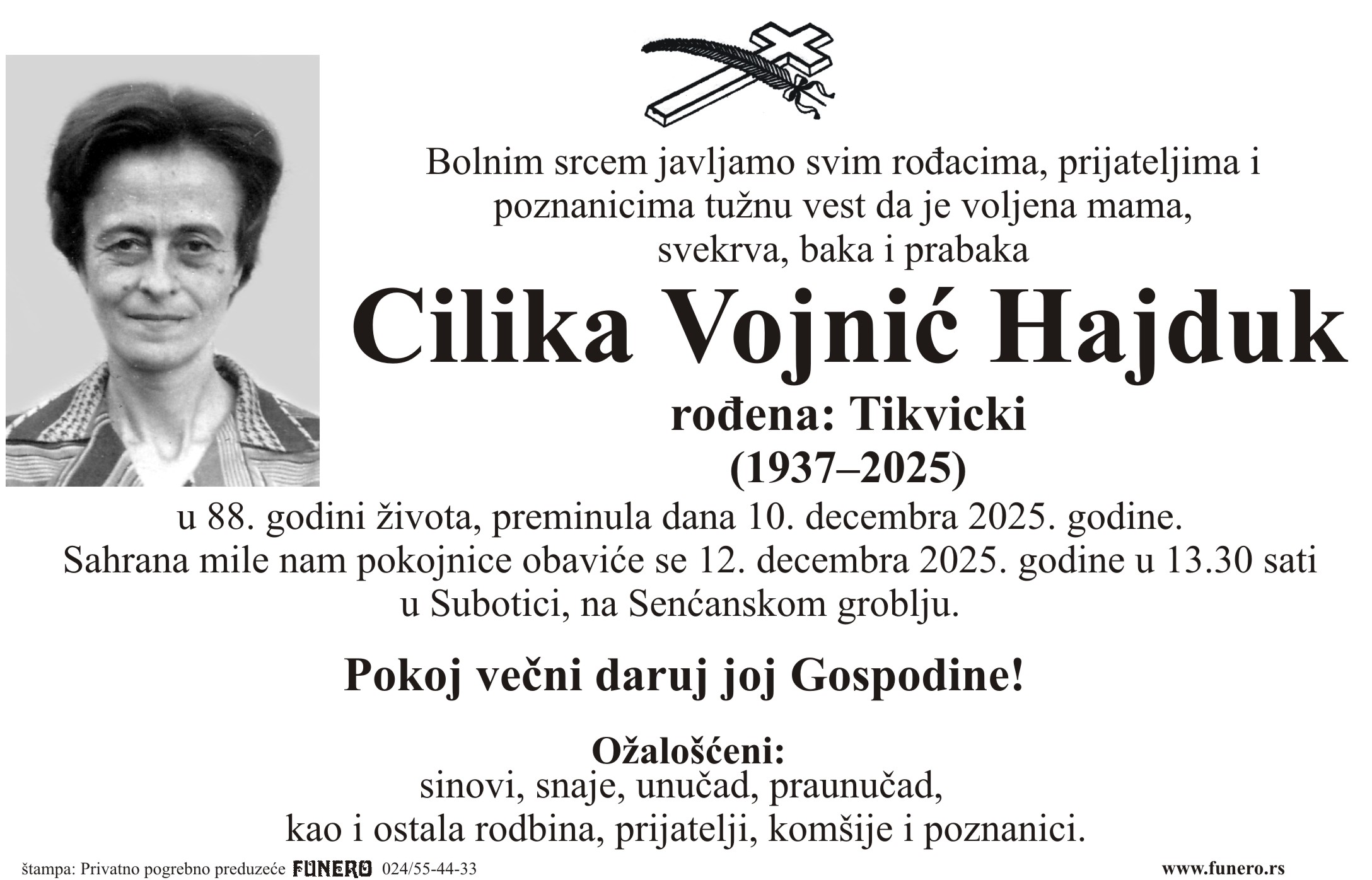 U 88. godini preminula je Cilika Vojnić Hajduk iz Subotice, iz ulice Šandora Petefija. Sahrana je 12. decembra u 13 sati i 30 minuta na Senćanskom groblju.