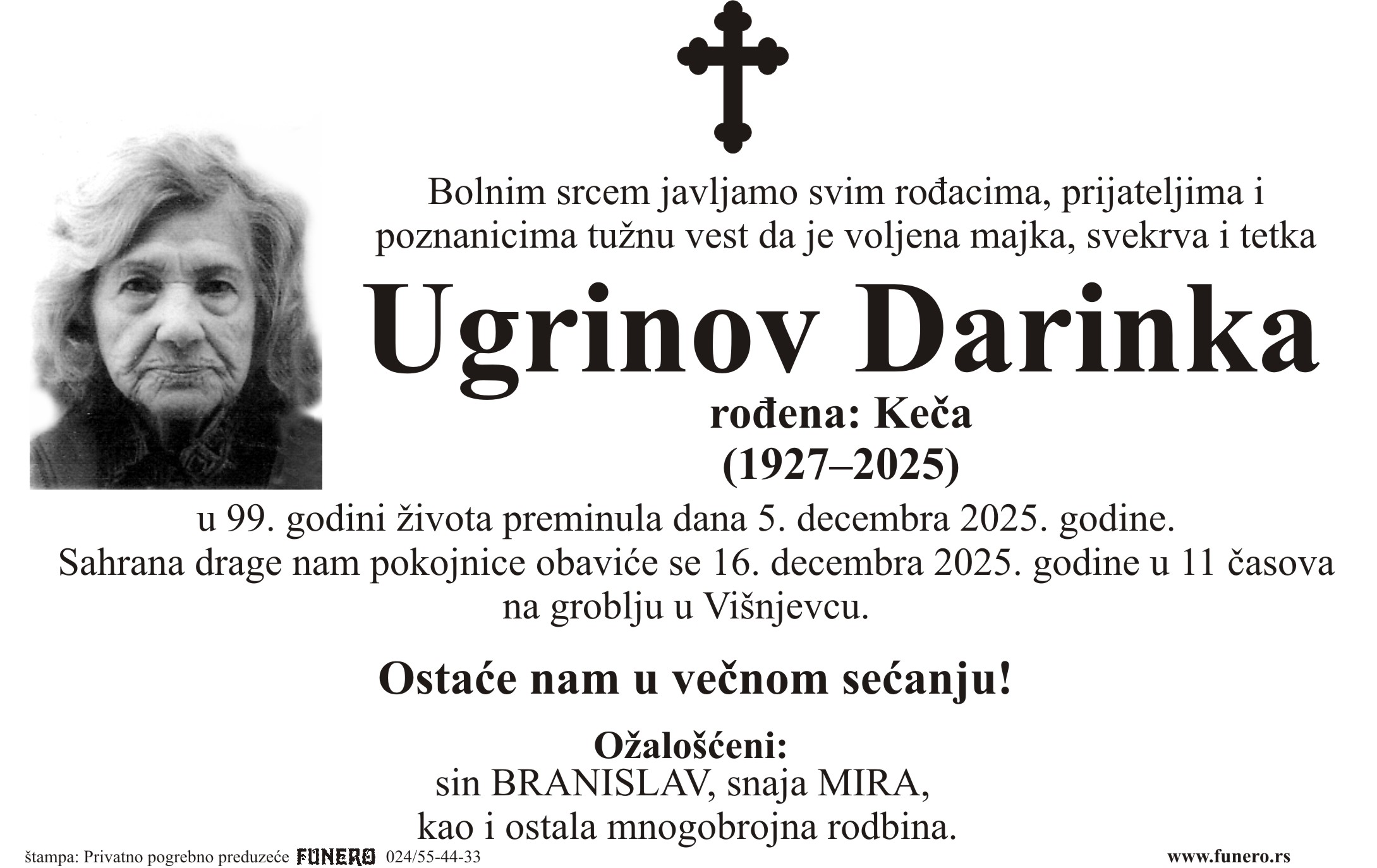 U 98. godini preminula je Darinka Ugrinov iz Subotice, iz Đevđelijske ulice. Sahrana je 16. decembra u 11 časova na groblju u Višnjevcu.