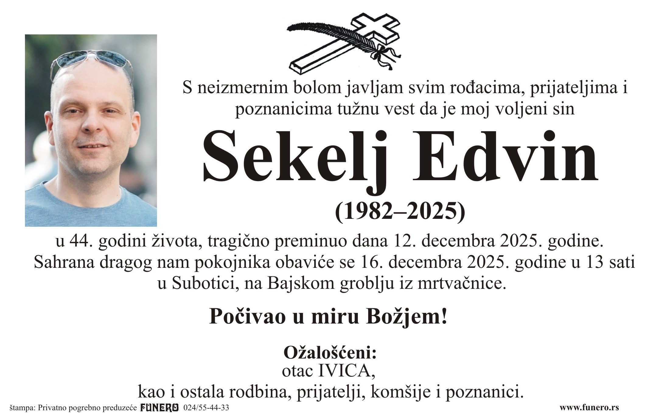 U 43. godini preminuo je Edvin Sekelj iz Subotice, iz ulice Georgi Dimitrova. Sahrana je 16. decembra u 13 sati na Bajskom groblju iz mrtvačnice.