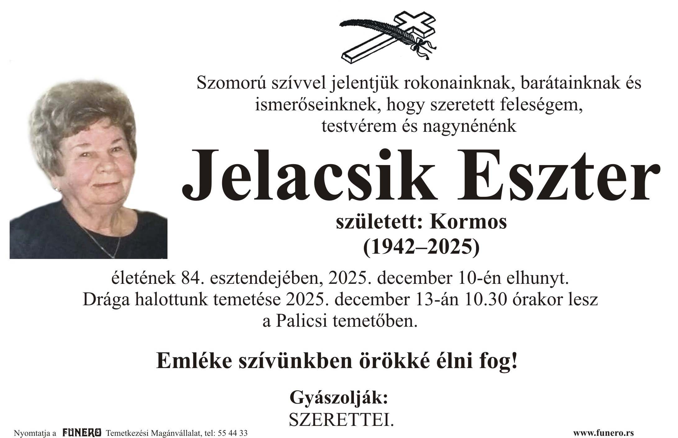 U 83. godini preminula je Ester Jelačik sa Palića, sa Trga Lasla Mađara. Sahrana je 13. decembra u 10 sati i 30 minuta na Palićkom groblju.