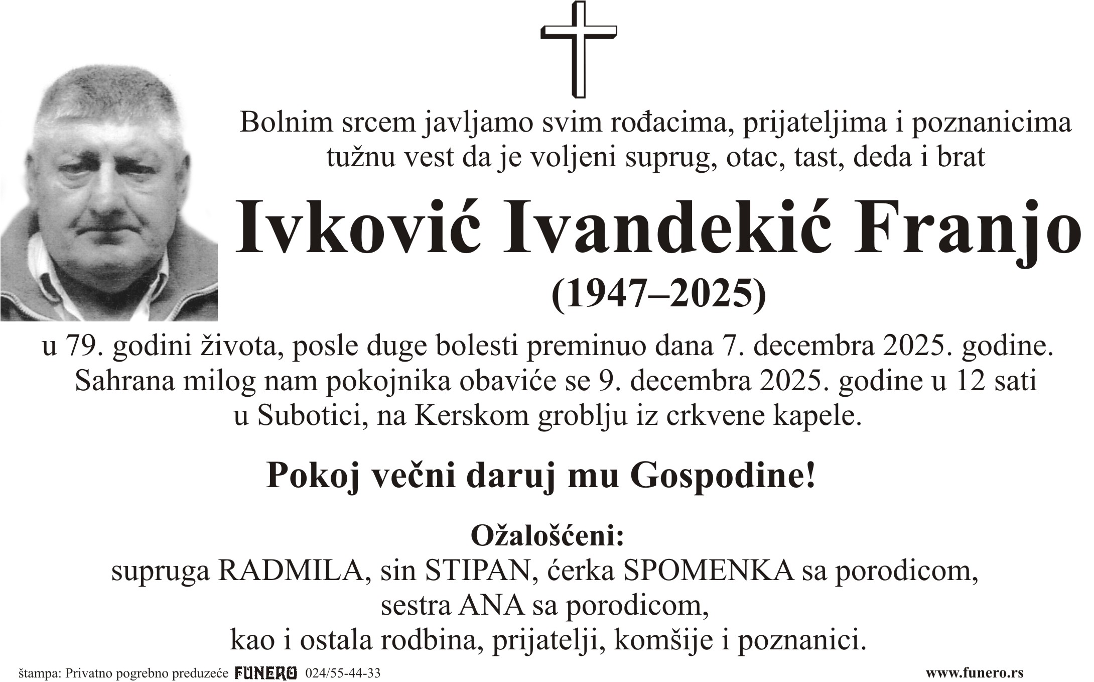 U 78. godini preminuo je Franjo Ivković Ivandekić iz Đurđina. Sahrana je 9. decembra u 12 sati na Kerskom groblju iz crkvene kapele.