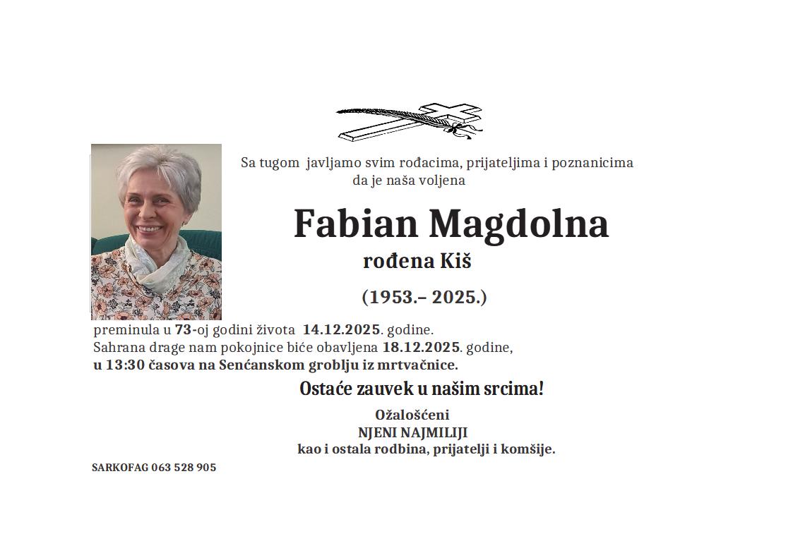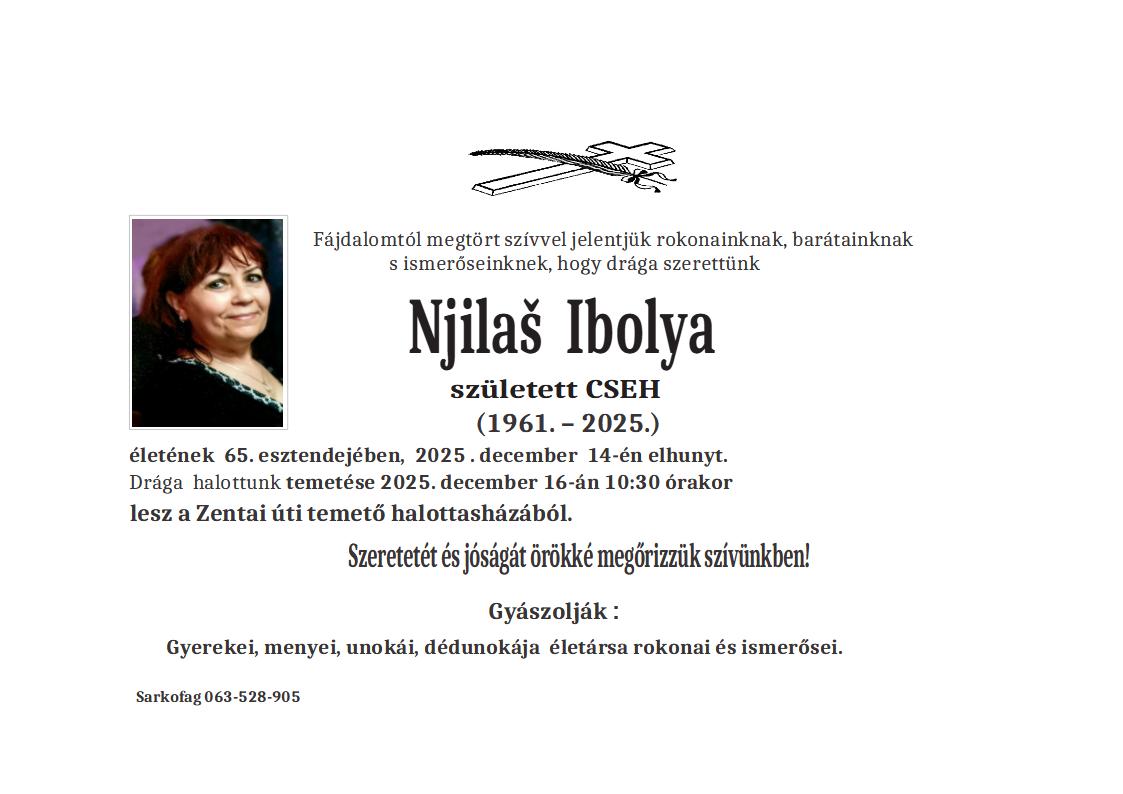 U 75. godini preminula je Edit Gence iz Subotice. Sahrana je 4. decembra u 13 sati na Bajskom groblju iz mrtvačnice.