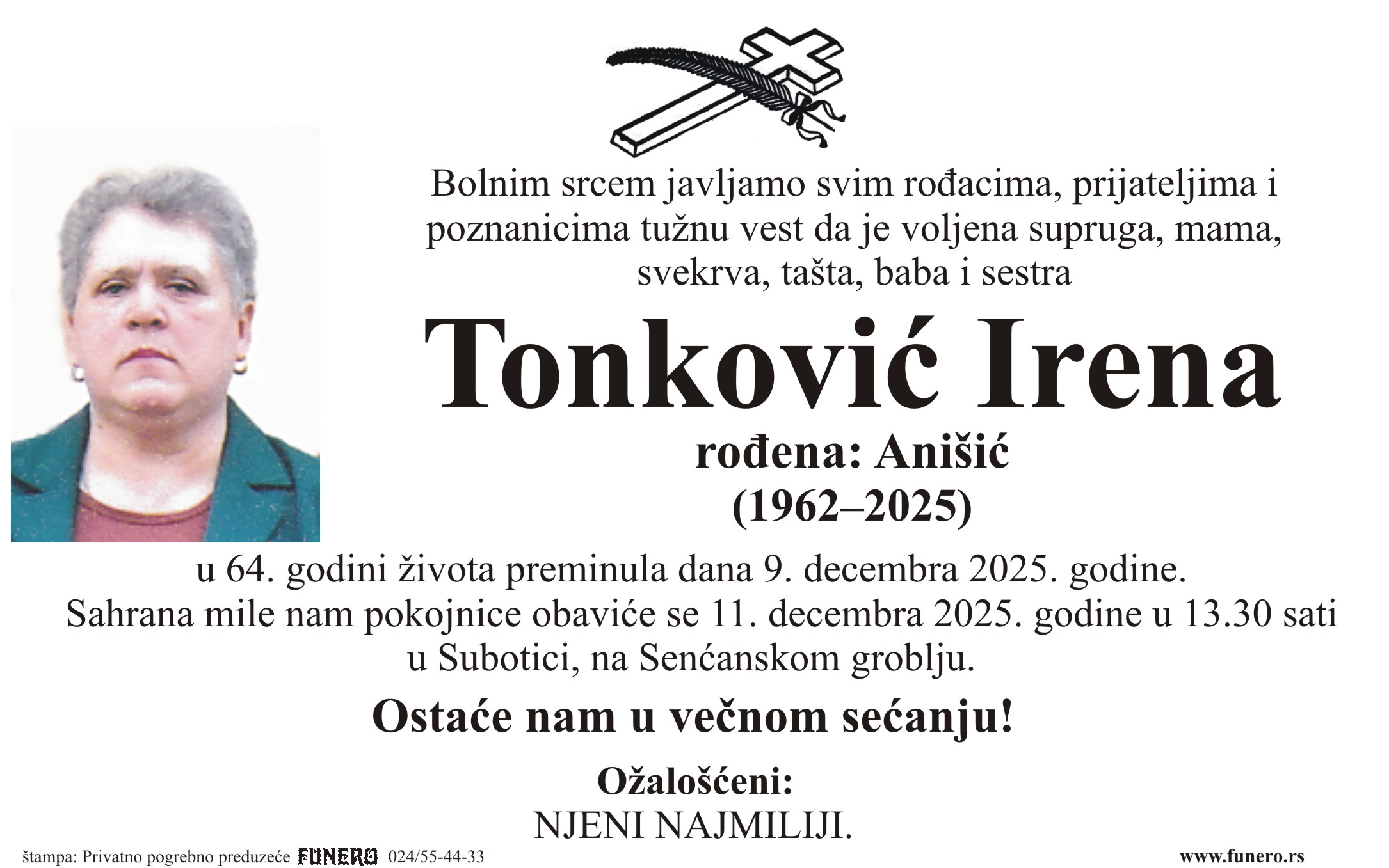 U 63. godini preminula je Irena Tonković iz Bikova. Sahrana je 11. decembra u 13 sati i 30 minuta na Senćanskom groblju.