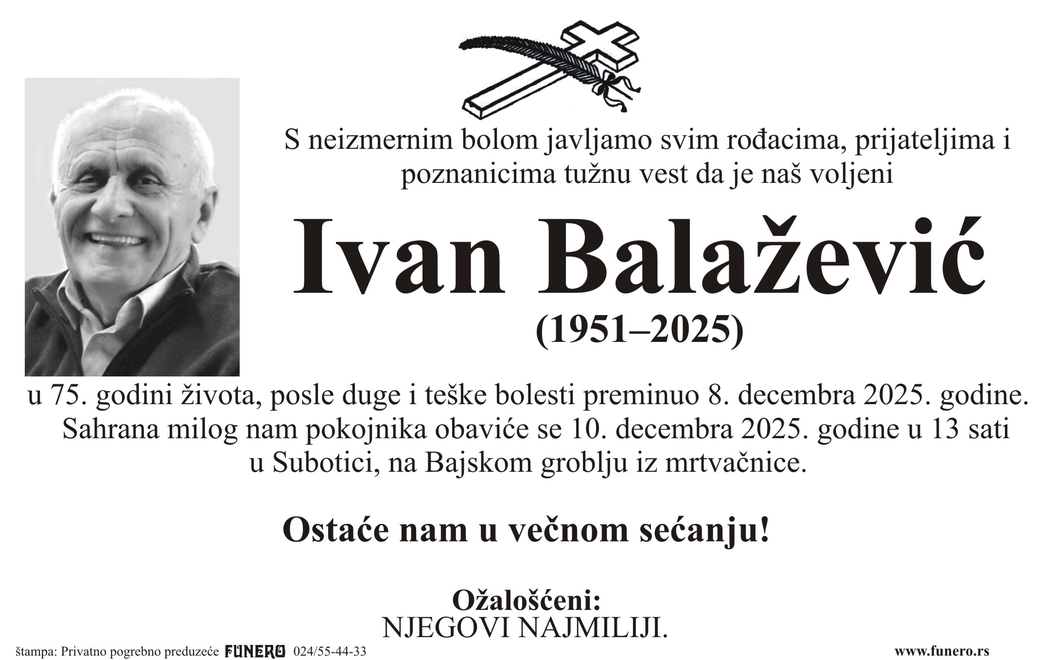 U 74. godini preminuo je Ivan Balažević iz Subotice, iz ulice Miloša Obilića. Sahrana je 10. decembra u 13 sati na Bajskom groblju iz mrtvačnice.