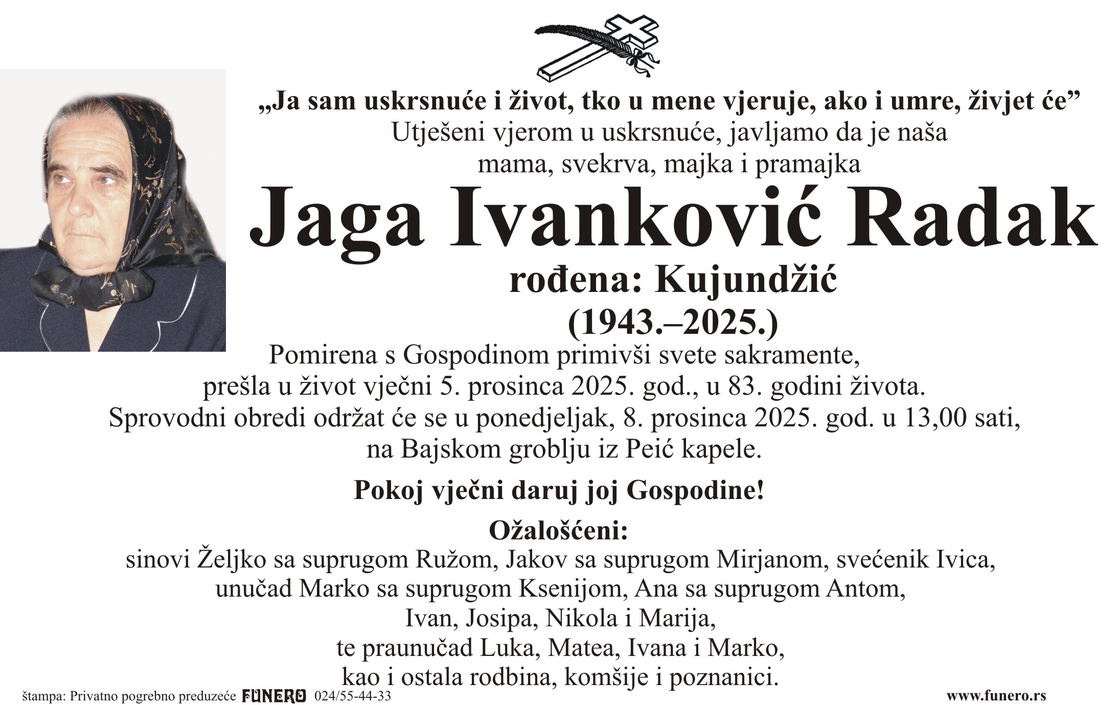 U 83. godini preminula je Jaga Ivanković Radak iz Subotice, sa Čantavirskog puta. Sahrana je 8. decembra u 13 sati na Bajskom groblju iz Peić kapele.