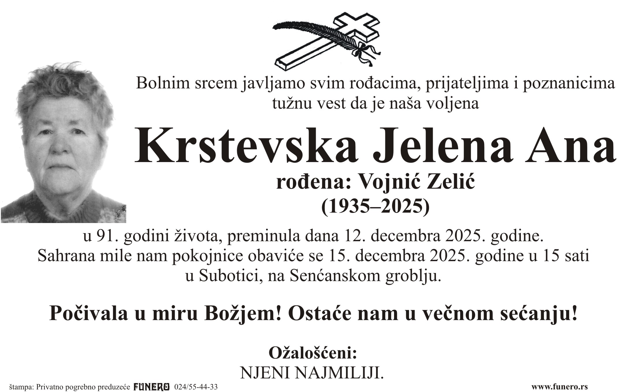 U 90. godini preminula je Jelena Ana Krstevska iz Subotice, iz ulice Braće Radića. Sahrana je 15. decembra u 15 sati na Senćanskom groblju.
