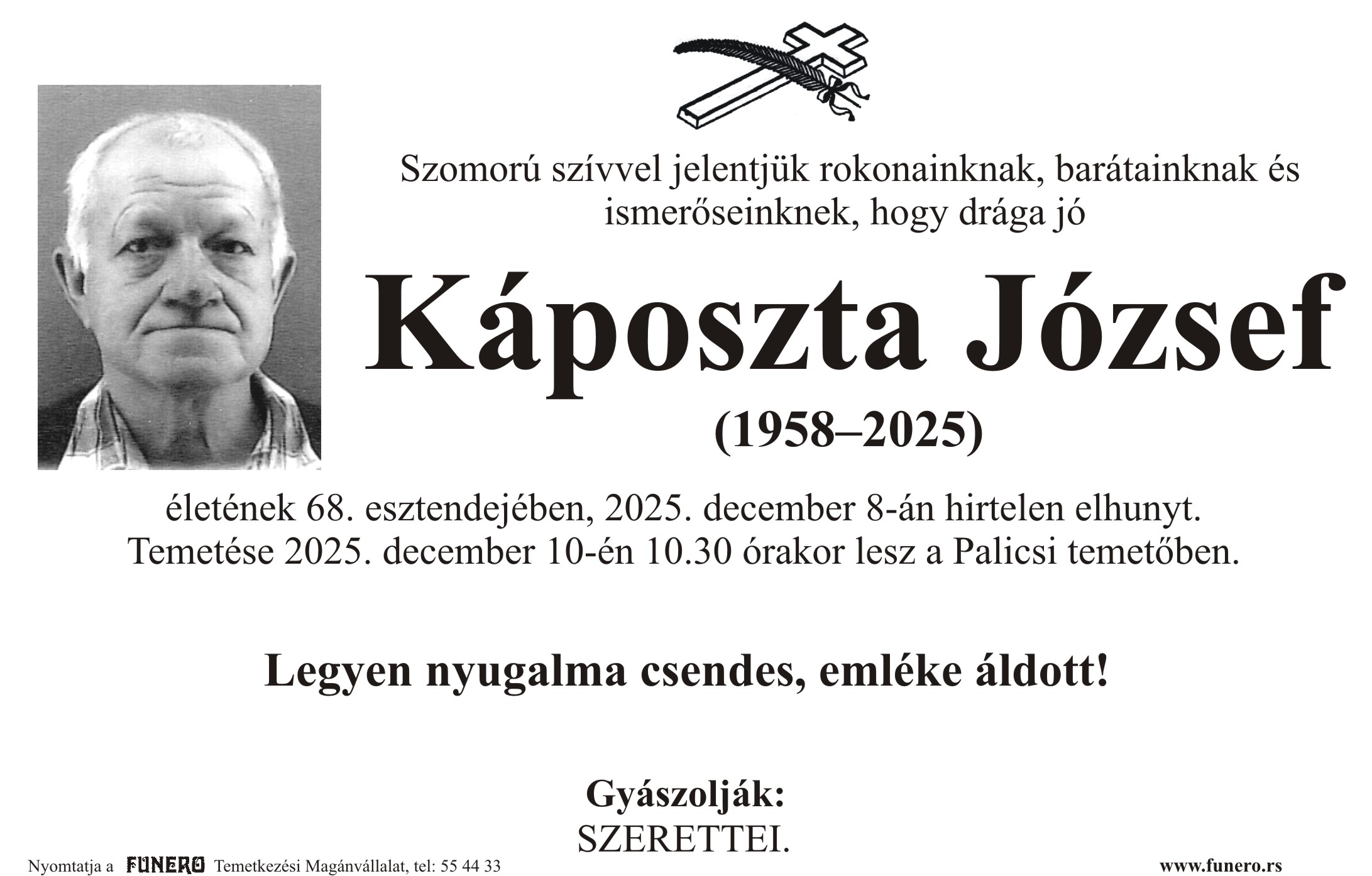 U 67. godini preminuo je Jožef Kaposta sa Palića, iz Ružine ulice. Sahrana je 10. decembra u 10 sati i 30 minuta na Palićkom groblju.