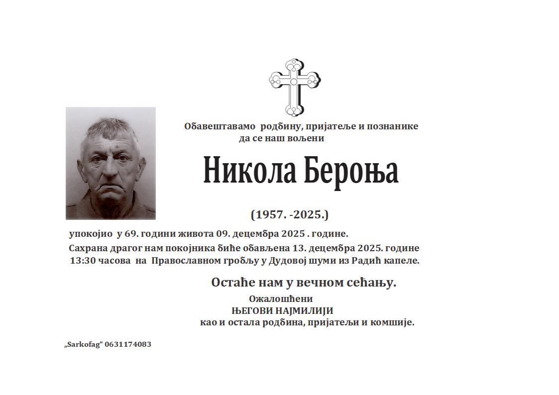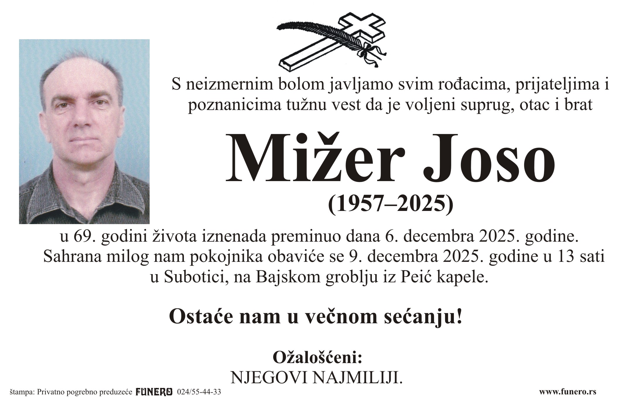 U 68. godini preminuo je Joso Mižer iz Male Bosne. Sahrana je 9. decembra u 13 sati na Bajskom groblju iz Peić kapele.