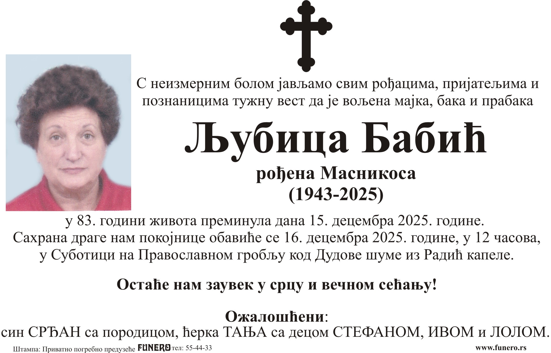 U 82. godini preminula je Ljubica Babić iz Subotice, iz ulice Josipa Kraša. Sahrana je 16. decembra u 12 časova na Pravoslavnom groblju kod Dudove šume iz Radić kapele.