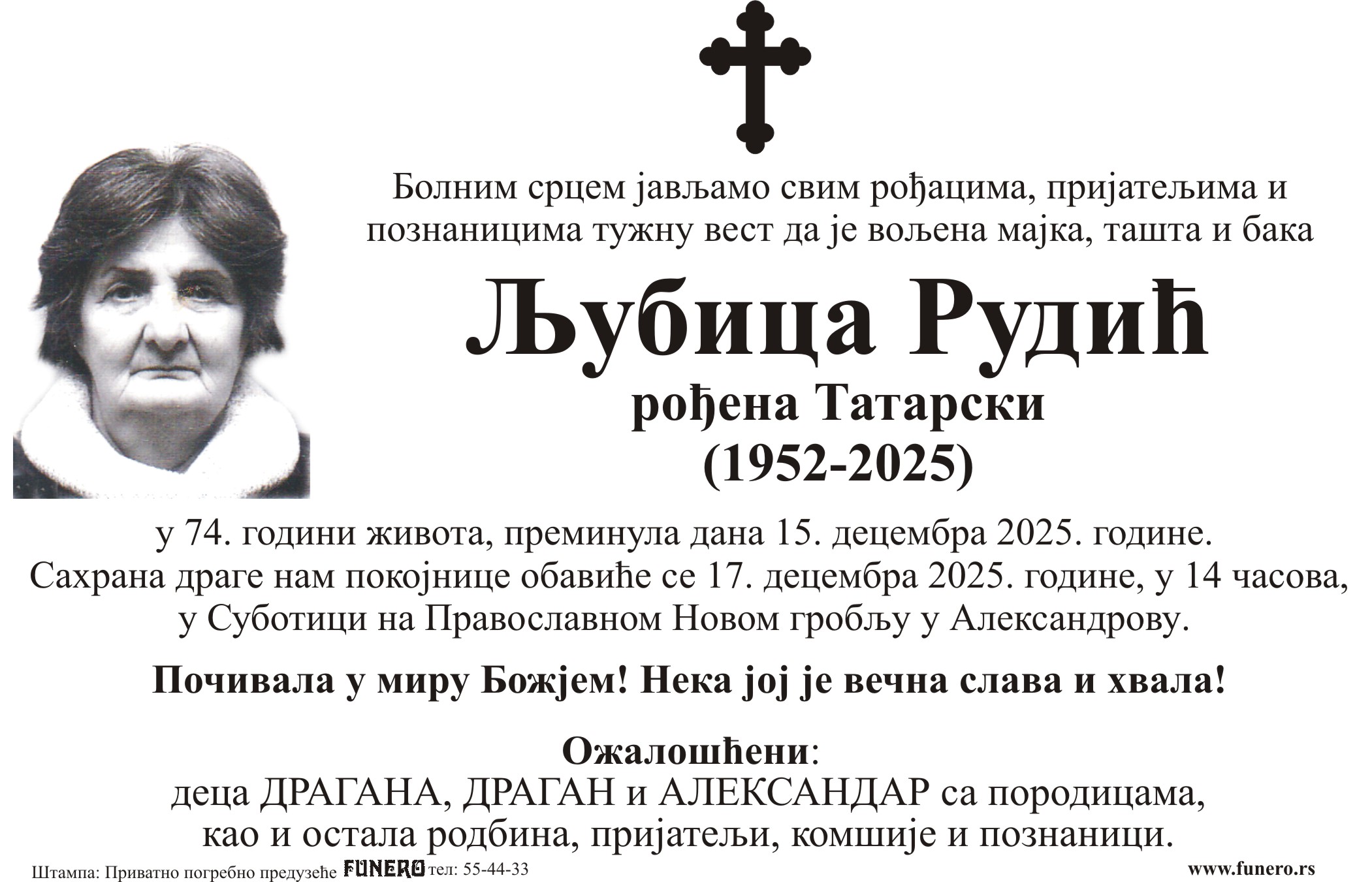 U 73. godini preminula je Ljubica Rudić iz Subotice, iz Tolminske ulice. Sahrana je 17. decembra u 14 časova na Pravoslavnom Novom groblju u Aleksandrovu.