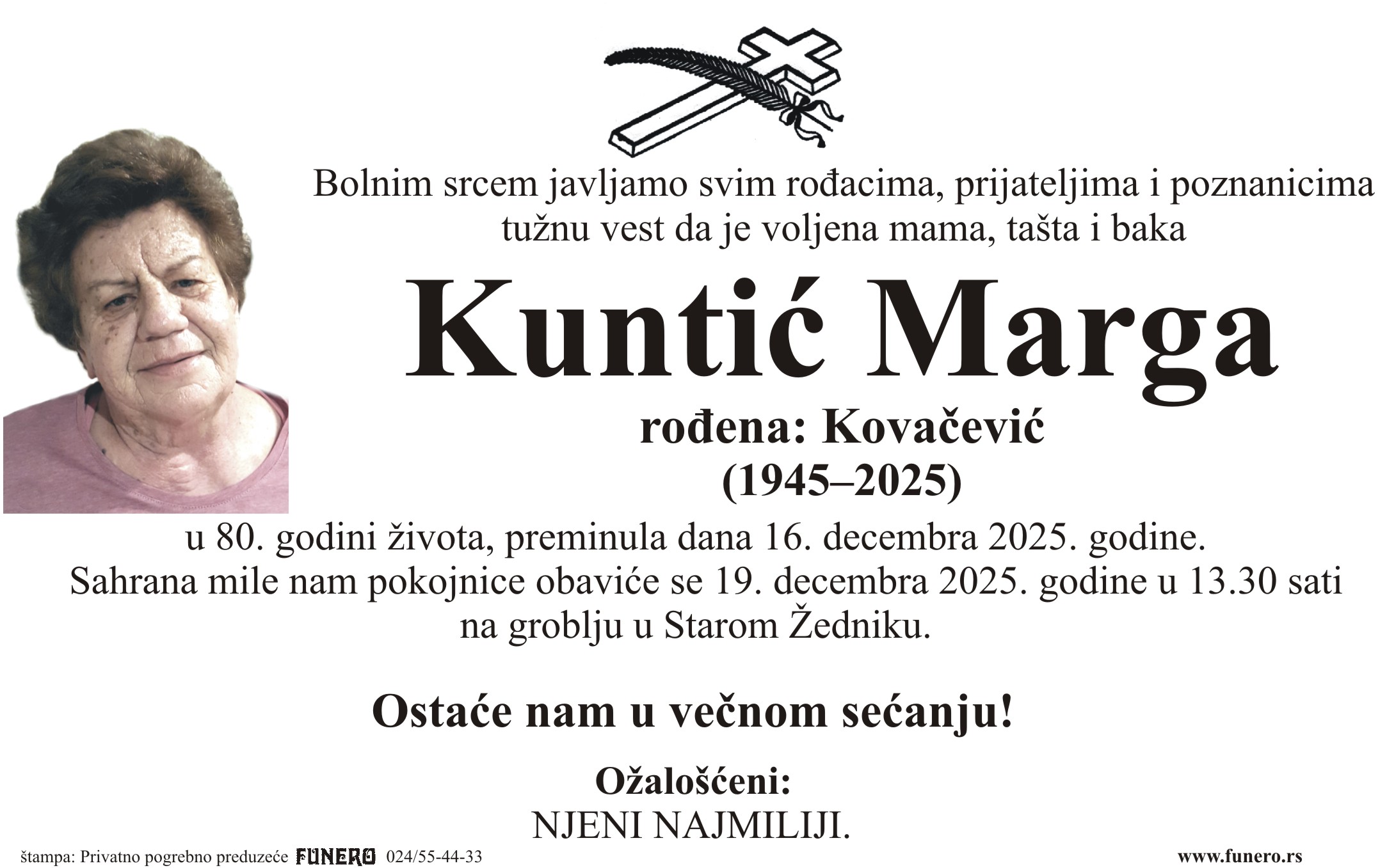 U 80. godini preminula je Marga Kuntić iz Starog Žednika, iz ulice Žarka Zrenjanina. Sahrana je 19. decembra u 13 sati i 30 minuta na groblju u Starom Žedniku.
