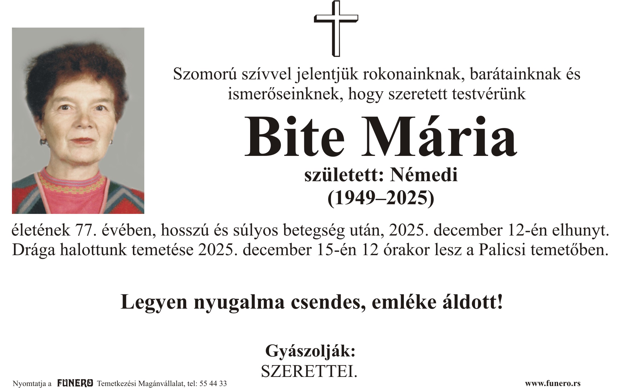 U 76. godini preminula je Maria Bite iz Hajdukova. Sahrana je 15. decembra u 12 sati na Palićkom groblju.