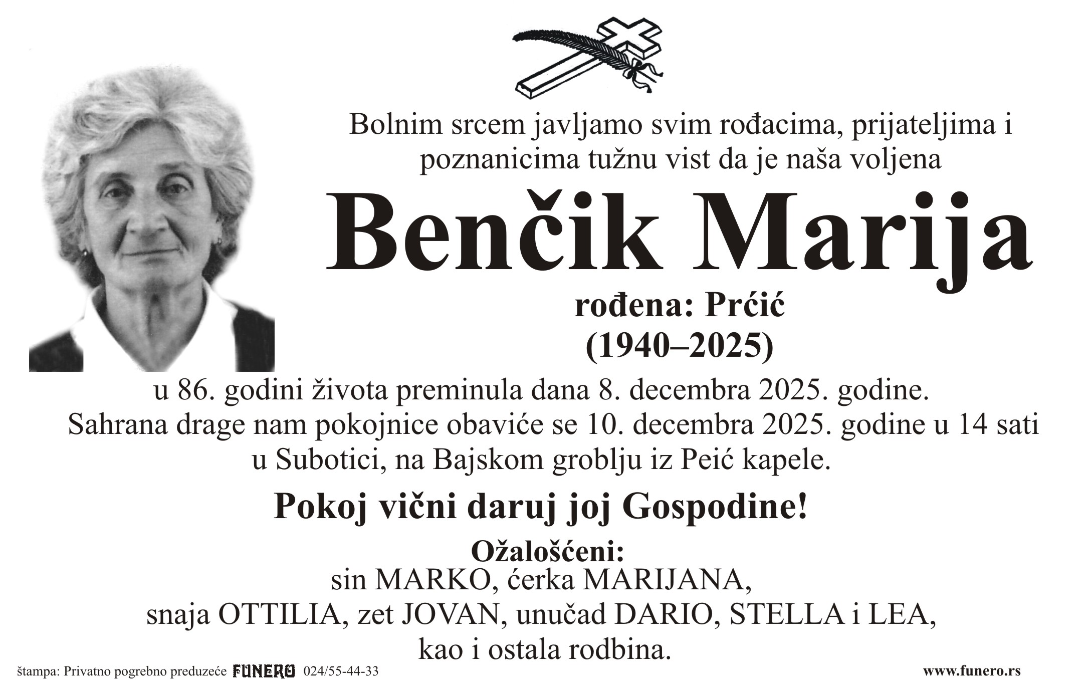 U 85. godini preminula je Marija Benčik iz Subotice, iz ulice Ljube Šercera. Sahrana je 10. decembra u 14 sati na Bajskom groblju iz Peić kapele.