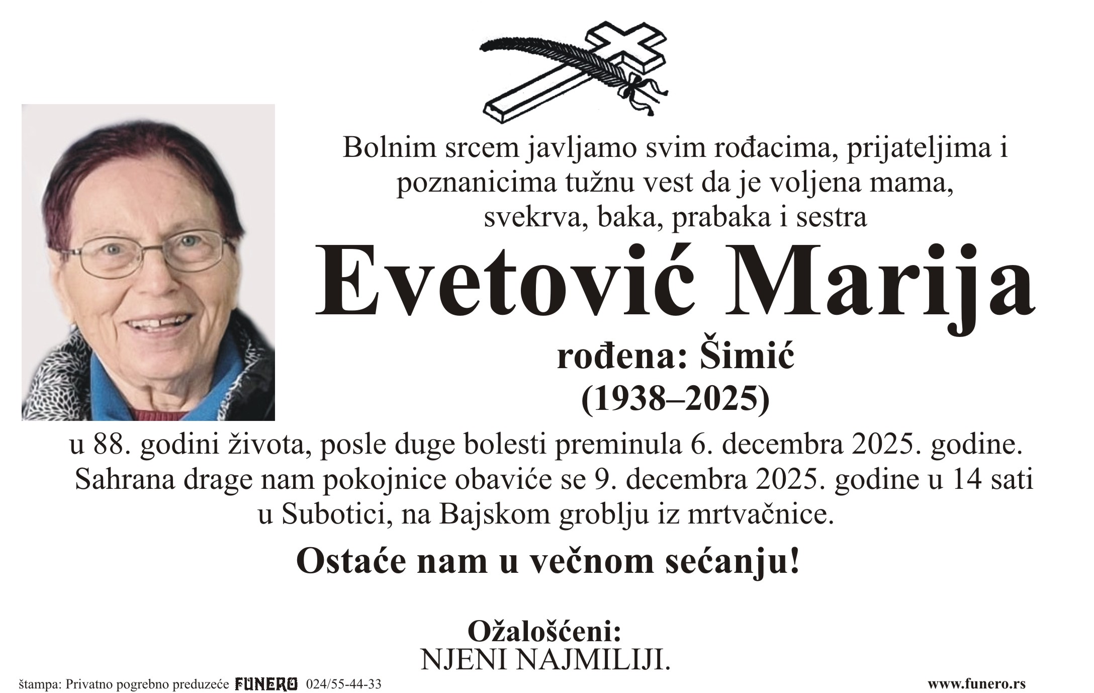 U 87. godini preminula je Marija Evetović iz Subotice, iz Omiške ulice. Sahrana je 9. decembra u 14 sati na Bajskom groblju iz mrtvačnice.
